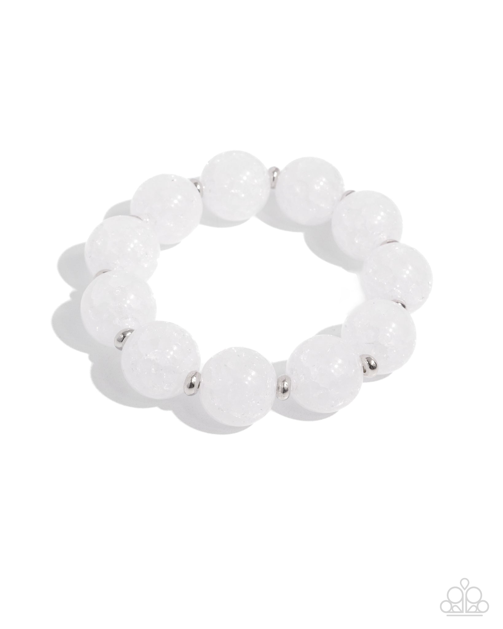 Infused with dainty silver accents, an oversized collection of crackly white glass-like beads are threaded along stretchy bands around the wrist for an icy look.