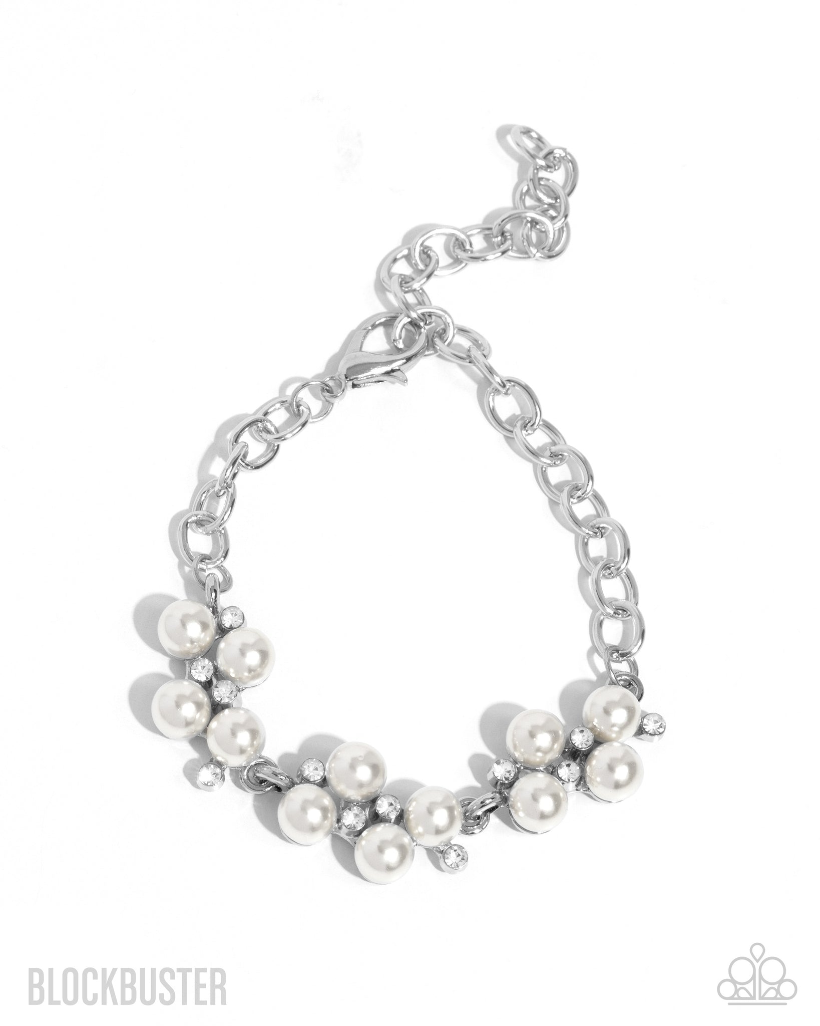 Cascading from a classic silver chain, clusters of shimmery white pearls and sparkling dainty, white rhinestones connect along the wrist, creating a vintage, timeless statement. Features an adjustable clasp closure.