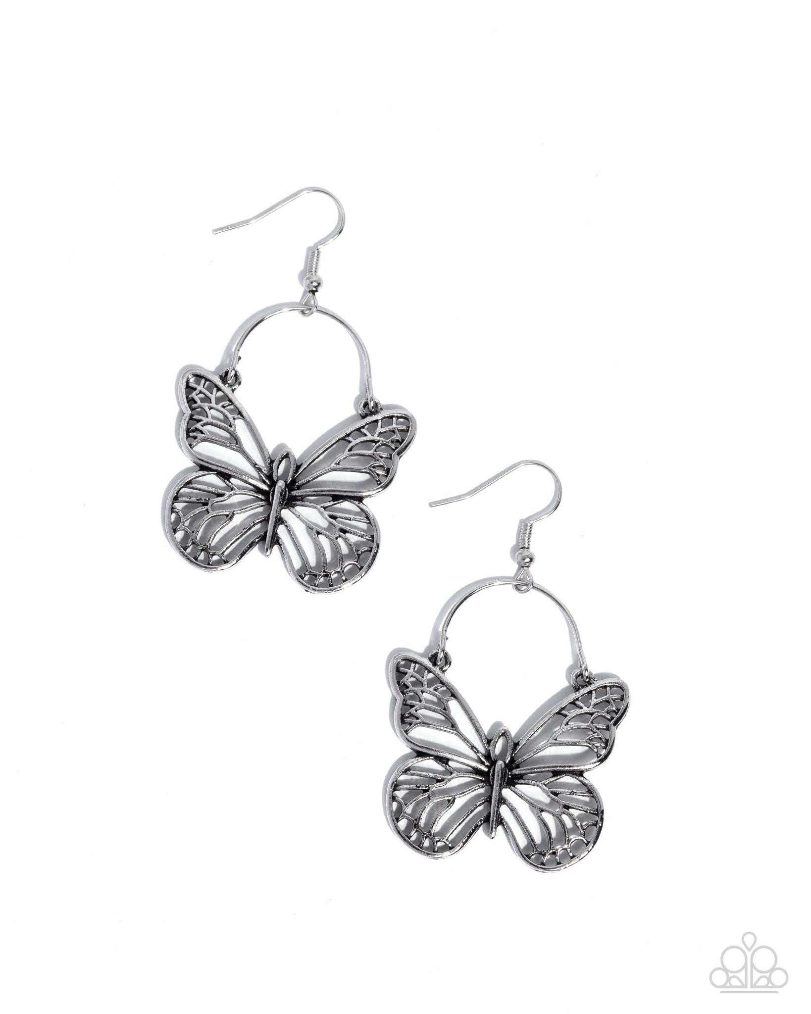 Suspended from the ends of a silver arch, a highly detailed, airy silver butterfly flutters below the ear for a whimsical whisper. Earring attaches to a standard fishhook fitting.