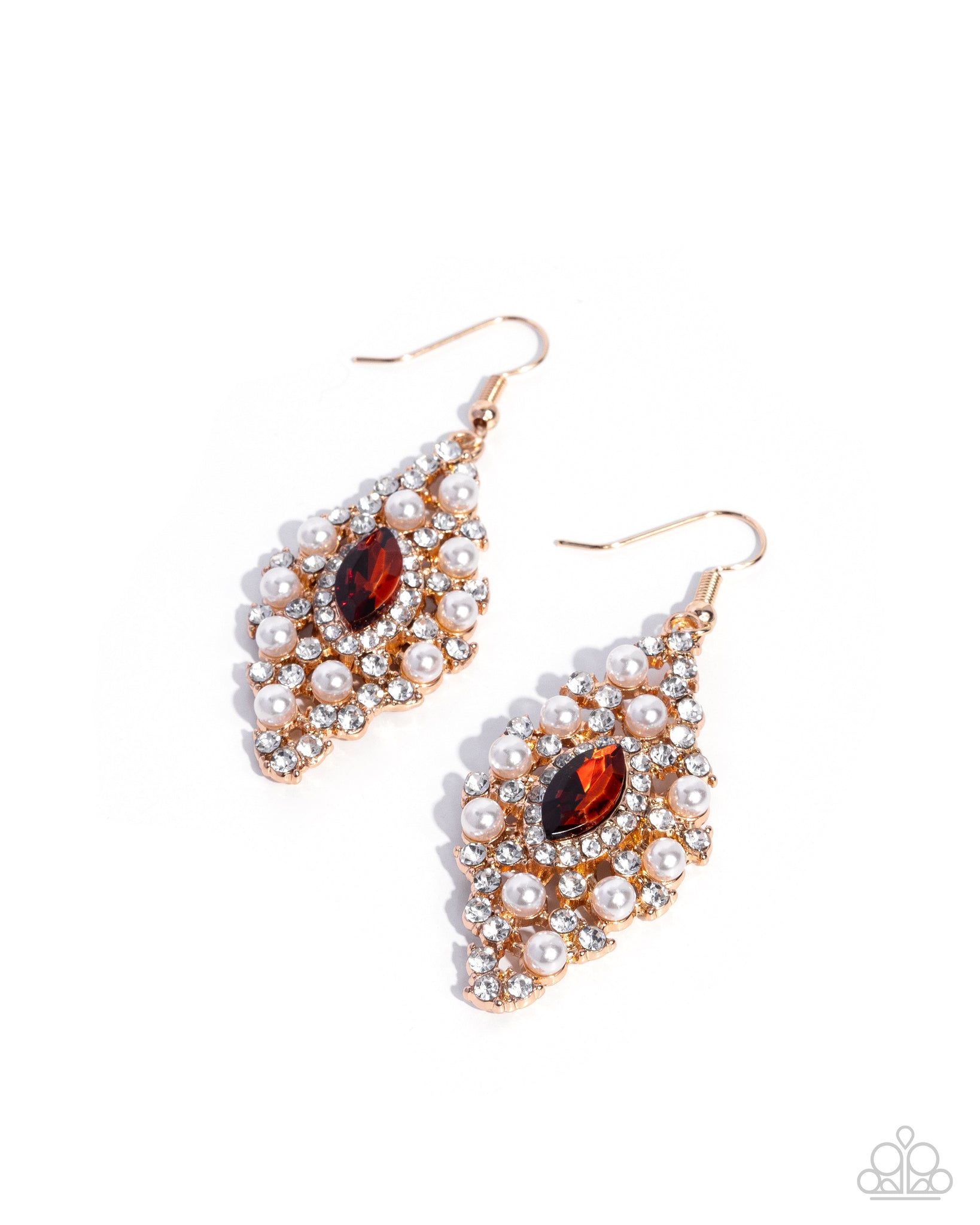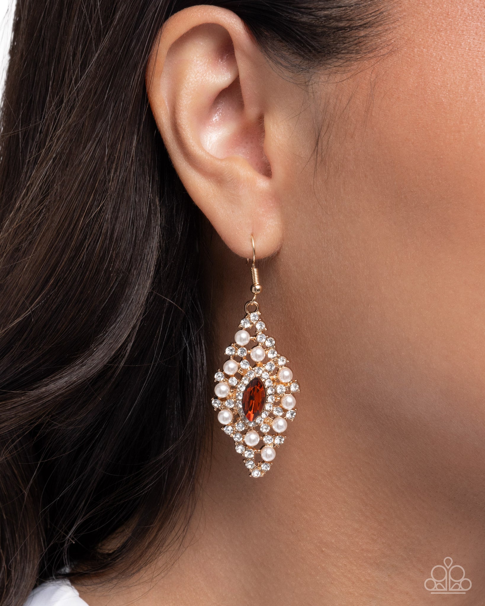 An explosion of glittery white rhinestones and glossy white pearls coalesces around a marquise-cut topaz gem bordered by white rhinestones into an exaggerated, airy, diamond-shaped lure, creating a dramatic statement piece. Earring attaches to a standard fishhook fitting.