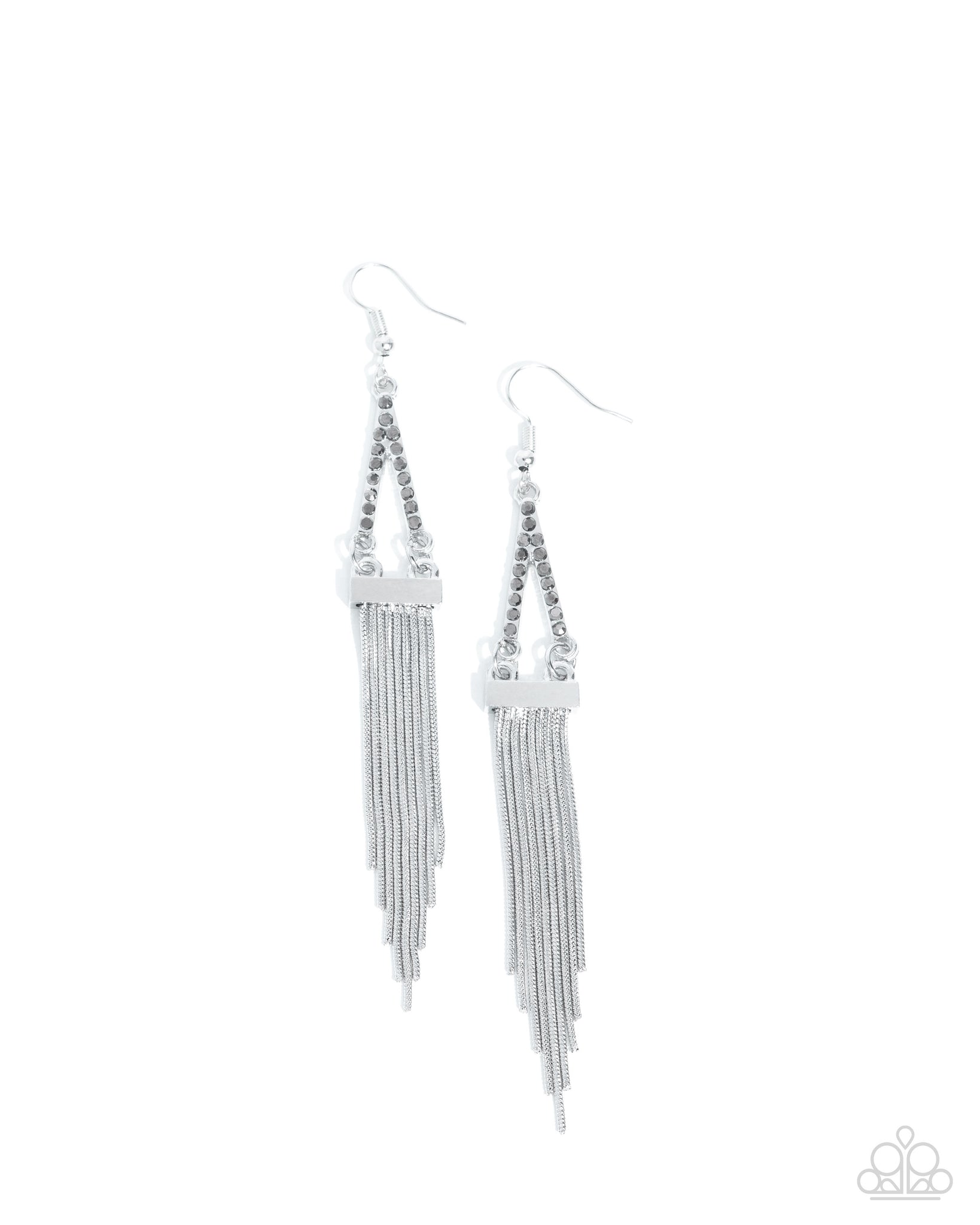 Dusted in hematite rhinestones, an a-shaped silver frame connects to a sleek horizontal silver bar, giving way to a tapered fringe of silver dainty snake chains for a commanding, chic lure. Earring attaches to a standard fishhook fitting.