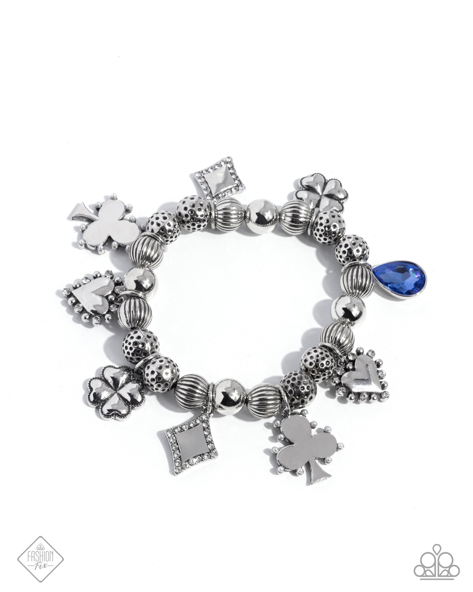 Pearl-bordered clubs, stud-and-dainty rhinestone-bordered silver hearts, white rhinestone-bordered diamond-shaped pendants, textured silver clovers, and a solitaire sapphire teardrop gem swing from a collection of shiny silver beads, linear-textured silver beads, and silver beads with a dot motif. Threaded along an elastic stretchy band, the charming bracelet creates an entertaining engaging centerpiece around the wrist.