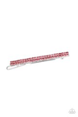 Two rows of glittery pink rhinestones are encrusted across the front of a silver frame, creating a glamorous display. Features a clamp barrette closure.