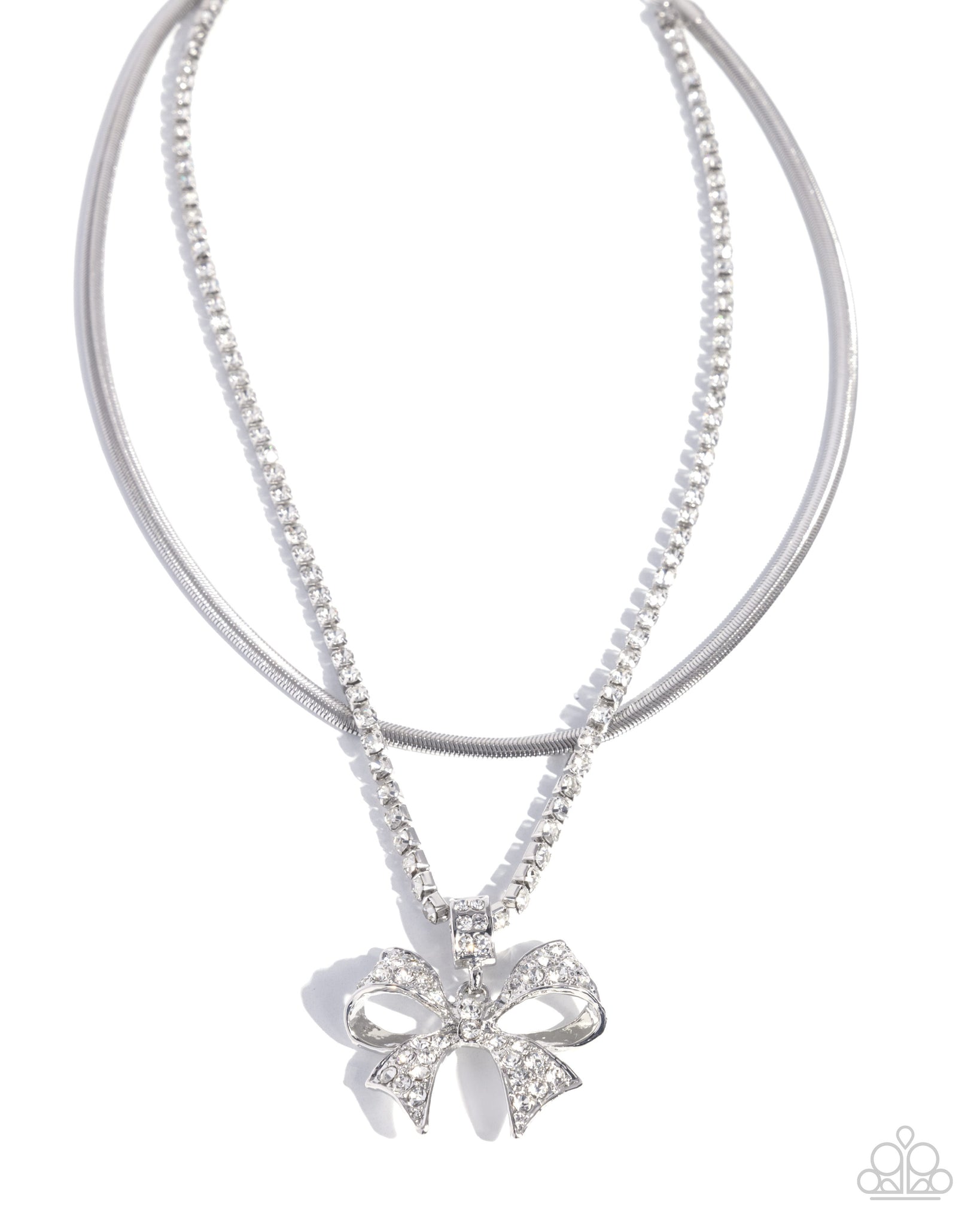 Featuring a layered design with a sleek silver herringbone chain and a strand of shimmering white rhinestones, a bow-shaped pendant, encrusted with matching rhinestones, creates a charming centerpiece. Features an adjustable clasp closure.