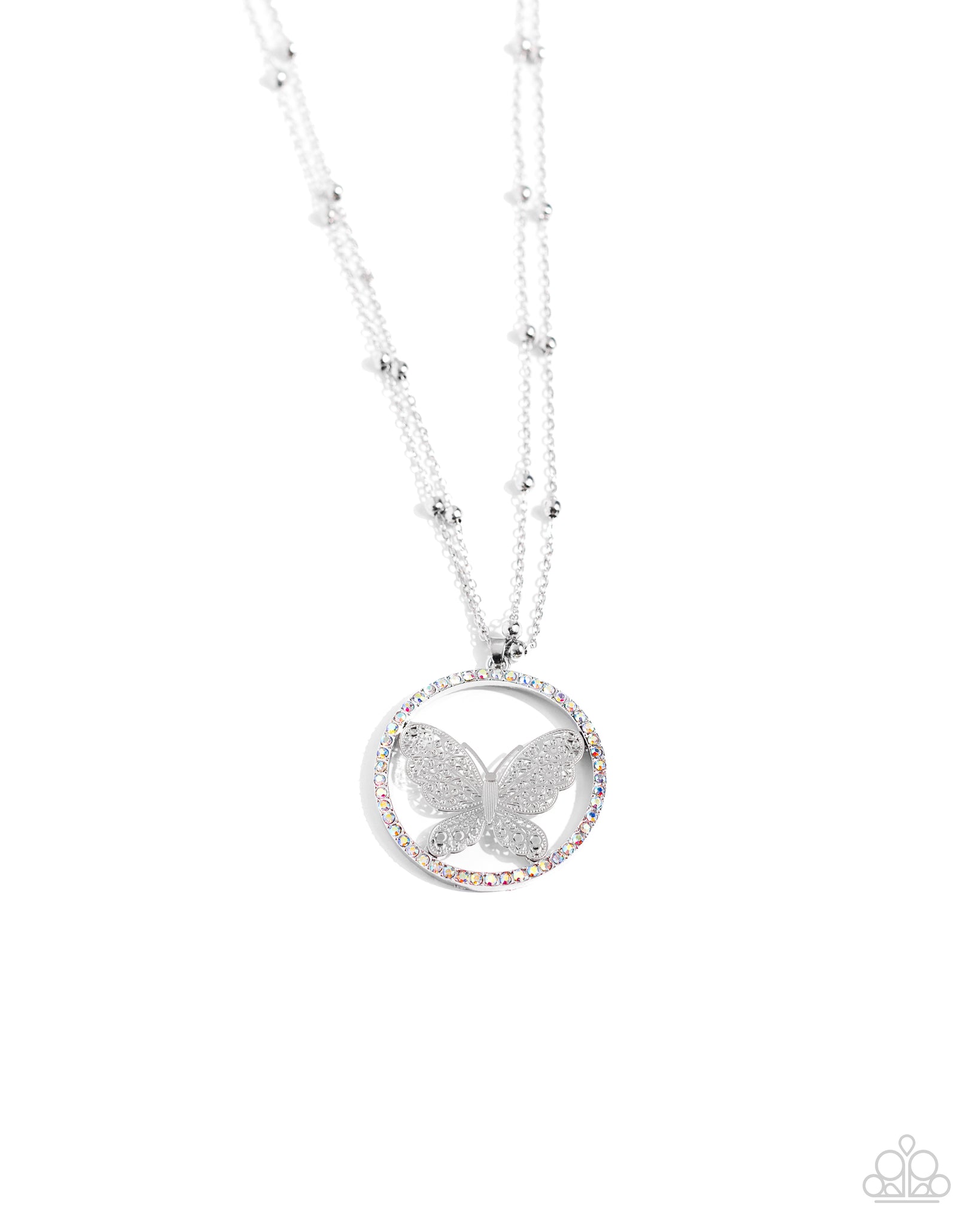 Fluttering along a double-stranded silver satellite chain, a silver filigree butterfly, centered in an iridescent rhinestone border twinkles below the neckline for a whimsical statement. Features an adjustable clasp closure. Due to its prismatic palette, color may vary.