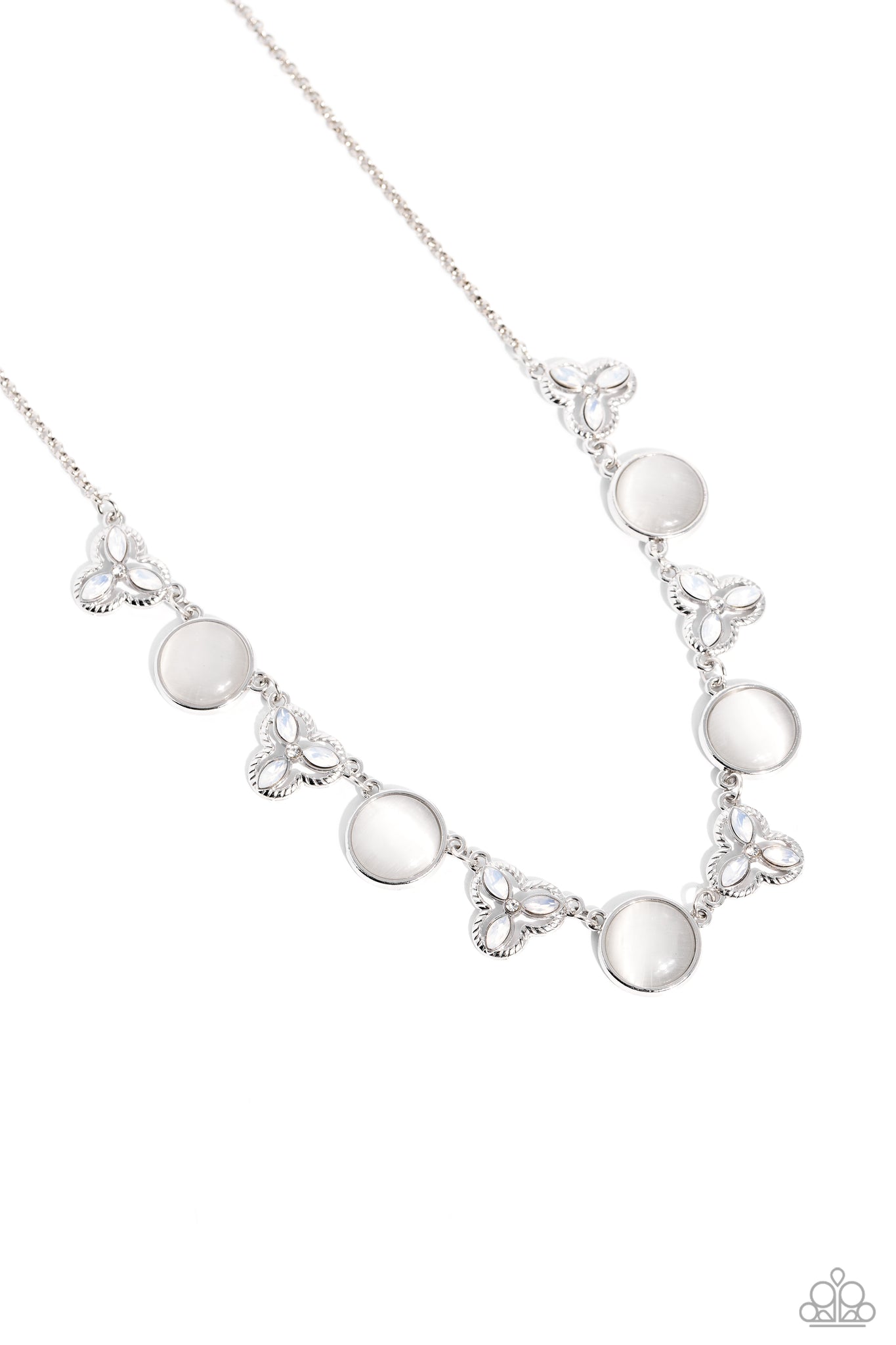 Modeled after trillium flowers, three marquise-cut gems with an opalescent finish bloom around dainty white rhinestones in airy silver frames. Pressed into shiny silver frames, white cat's eye stones glimmer in between the florals for a royally whimsical display below the collar. Features an adjustable clasp closure.