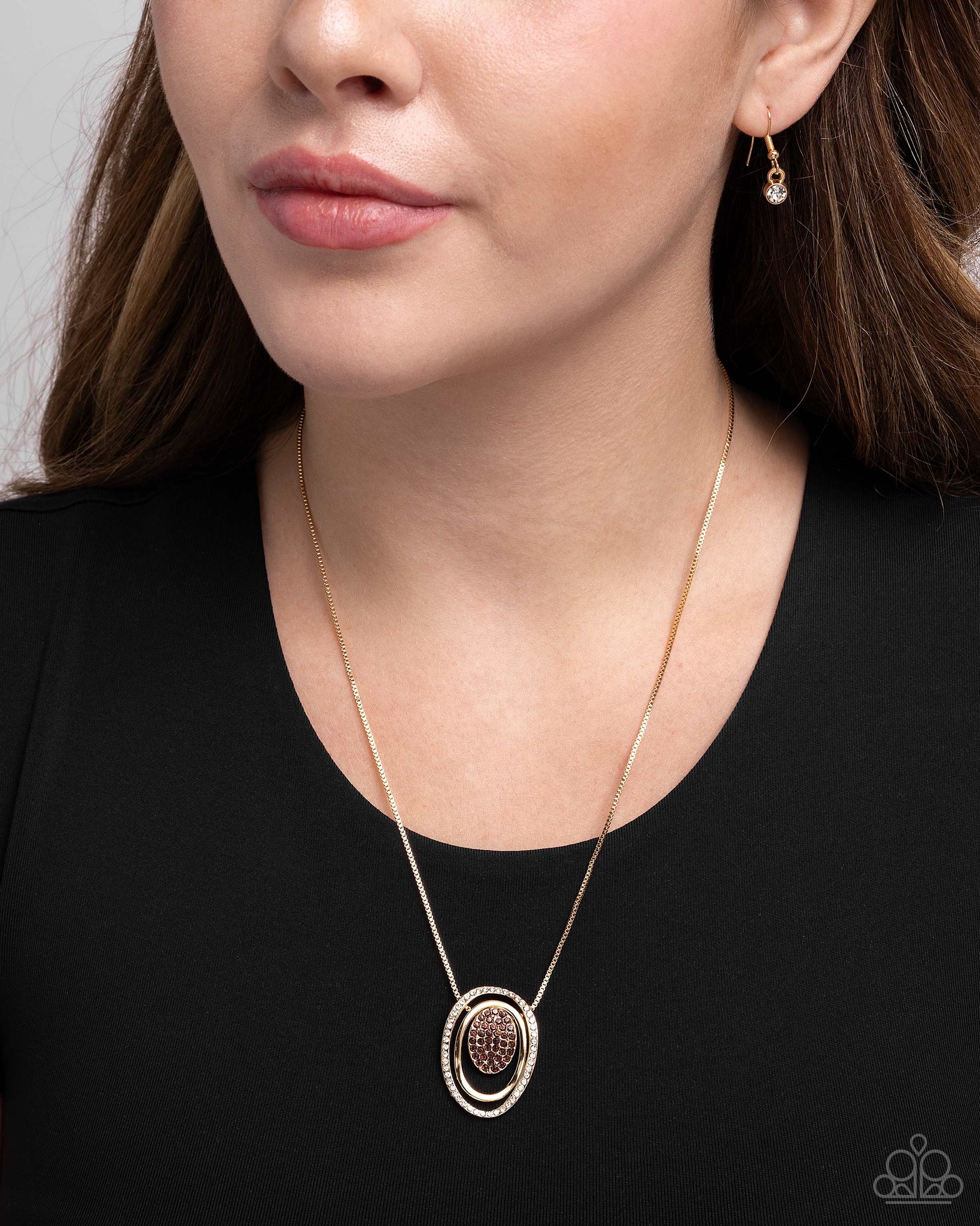 Asymmetrical gold oval hoops join into an abstract pendant at the bottom of a gold box chain for an industrial flair. The outermost hoop is dusted in white rhinestones while the the innermost oval pendant is dusted in tea rhinestones for some eye-catching shimmer. Features an adjustable clasp closure.