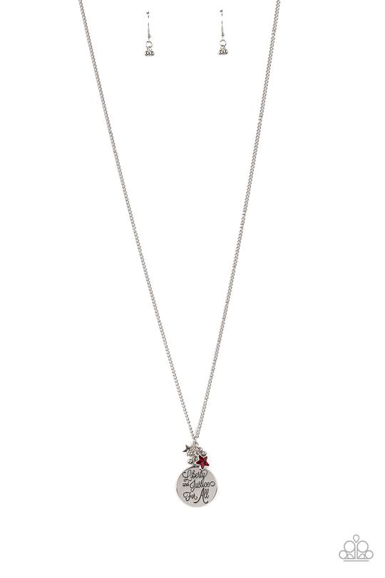 Stamped in the phrase, "Liberty and Justice For All," a silver disc joins a silver star charm and a glittery red rhinestone star pendant at the bottom of a lengthened silver chain for a patriotic inspired look. Features an adjustable clasp closure.