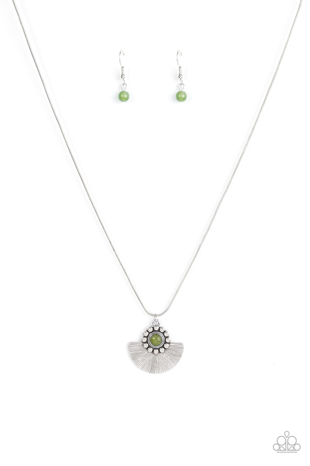 Bordered in a ring of flat silver studs, a mystical green bead adorns the top of a textured silver half moon pendant that glides along a rounded silver snake chain for an ethereal fashion. Features an adjustable clasp closure.
