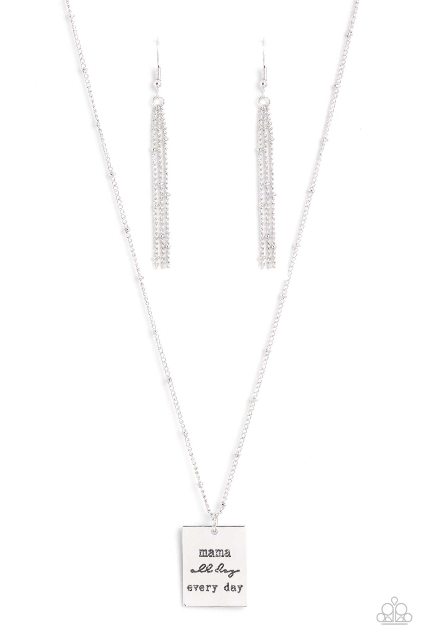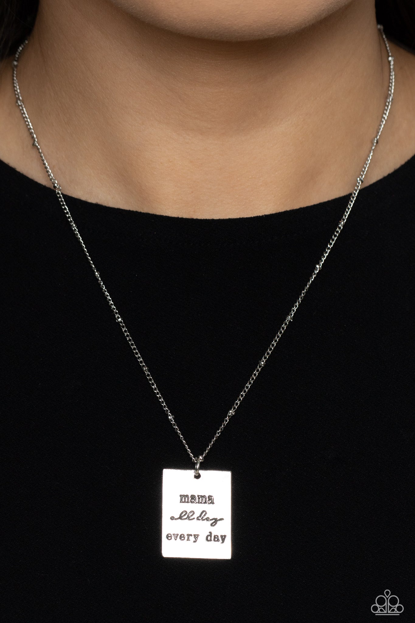 Infused with dainty silver studs on a dainty silver chain, a silver rectangular plate is stamped with the phrase "mama all day every day," for a monochromatic, minimalistic tribute. Features an adjustable clasp closure.