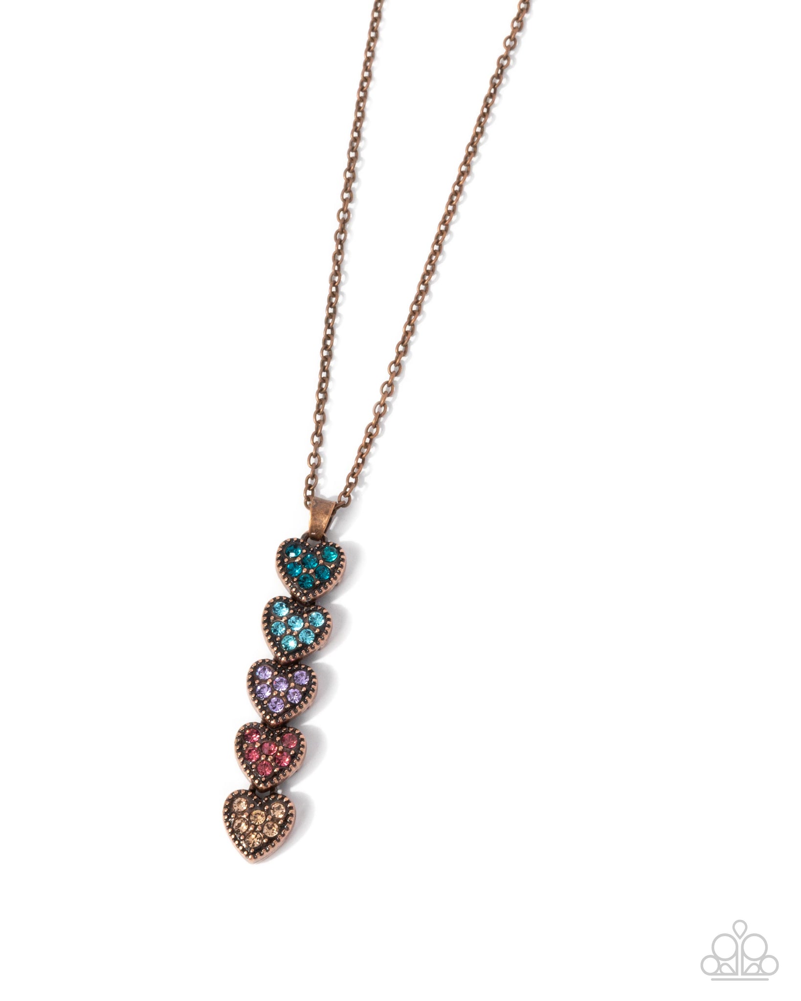 A copper chain features a vertical pendant of heart-shaped frames, each adorned with a different color of rhinestones. Features an adjustable clasp closure.