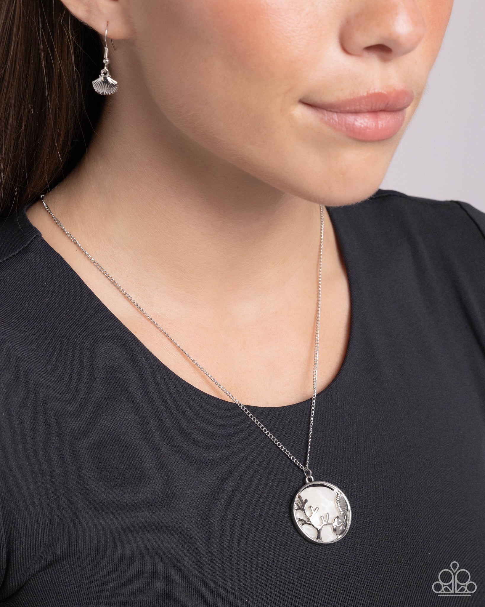 Featuring a white stone center, various silver ocean-inspired charms, including a seashell, sand dollar, and aquatic plant create a delicate overlay that connects to the silver pendant for a classy coastal display. Features an adjustable clasp closure. As the stone elements in this piece are natural, some color variation is normal.