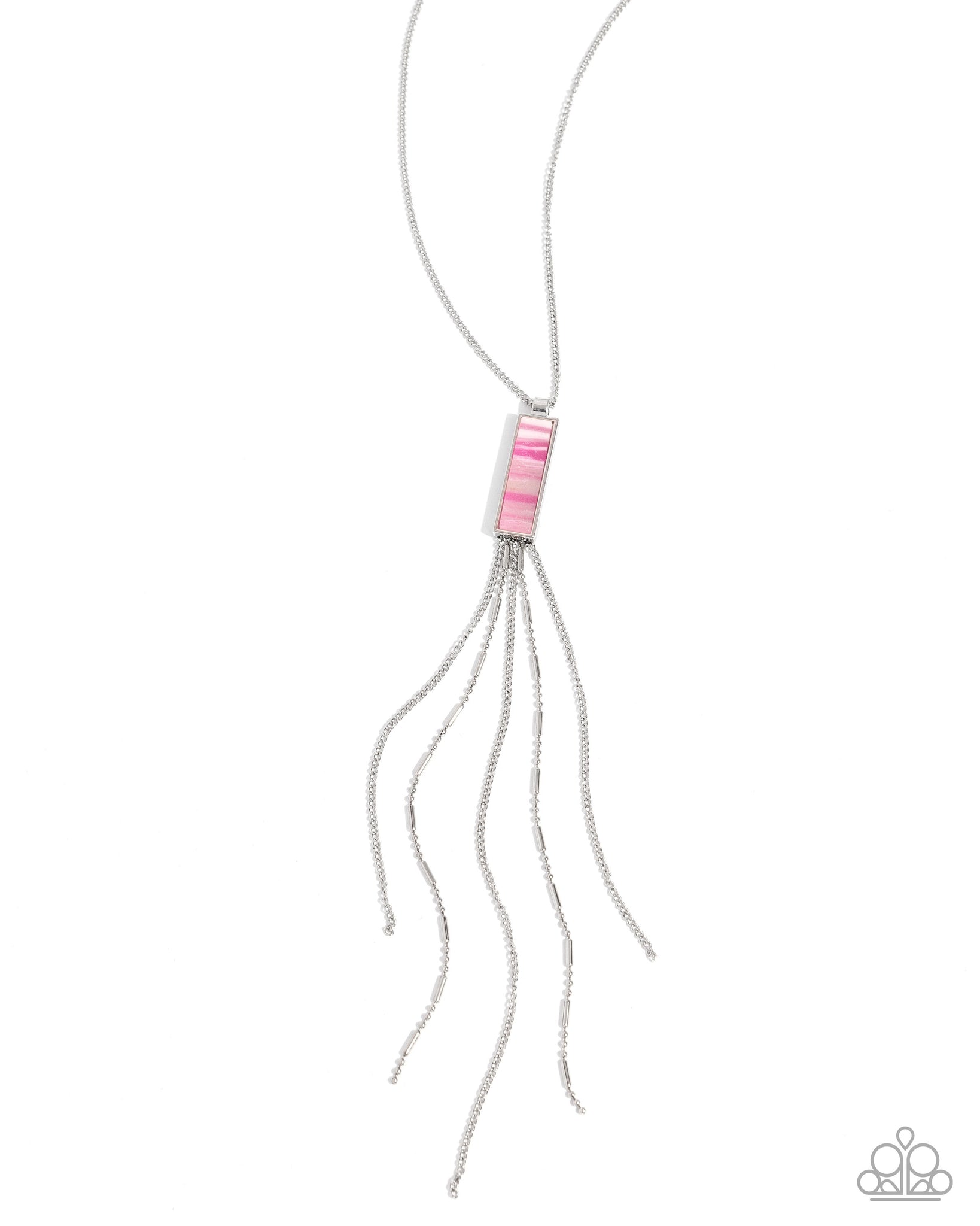 Gliding along a classic silver chain, a pink multicolored-striped rectangular stone is pressed in a thin silver frame giving way to a tassel of cylinder-infused ball and classic silver chains for an eye-catching, earthy eclectic display. Features an adjustable clasp closure. As the stone elements in this piece are natural, some color variation is normal.