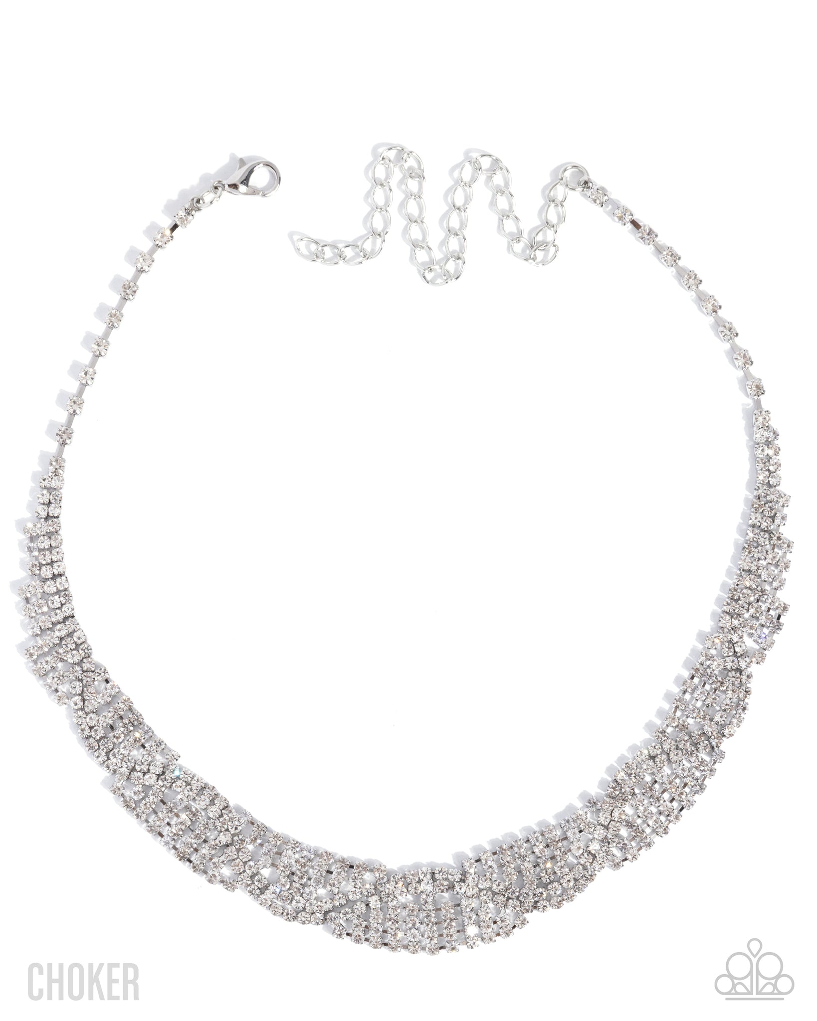 Featuring sleek square fittings, a strand of glittery white rhinestones elongate and connect into dazzling rows and plates of additional white rhinestones in silver square fittings around the collar for a glittery twist. Features an adjustable clasp closure.