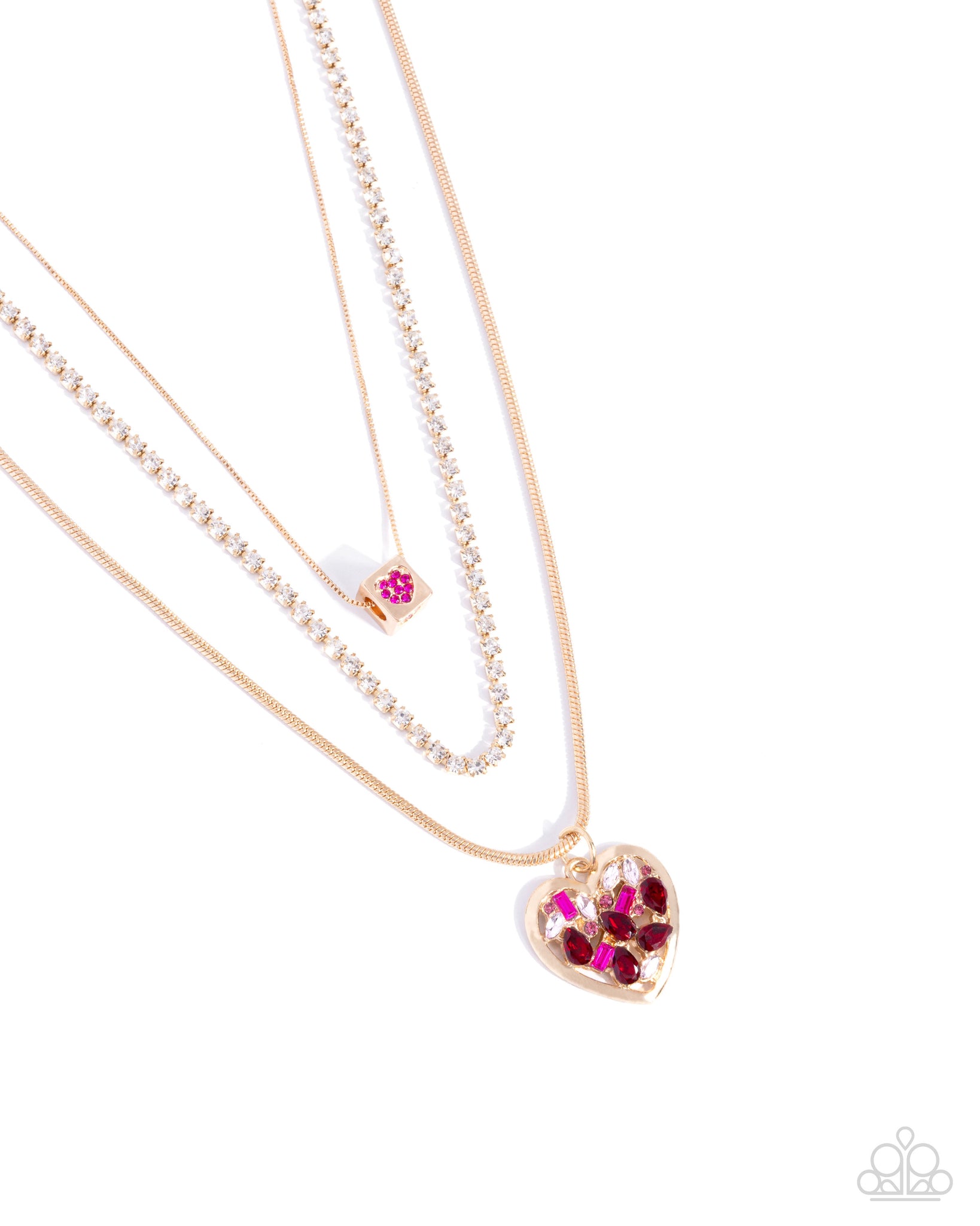A mismatched collection of dainty gold box, gold snake, and white rhinestones in square gold pronged fittings layers below the neckline. Gliding along the uppermost dainty box chain, a gold cube with white, light rose, rose, and fuchsia rhinestone hearts on various sides shimmers. Featuring additional rose, light red, white, and fuchsia shades, a collection of marquise-cut, emerald-cut, teardrop, and round rhinestones and gems scatter atop the front of a gold heart pendant that glides along the lowermost chain for a heartfelt finish. Features an adjustable clasp closure.