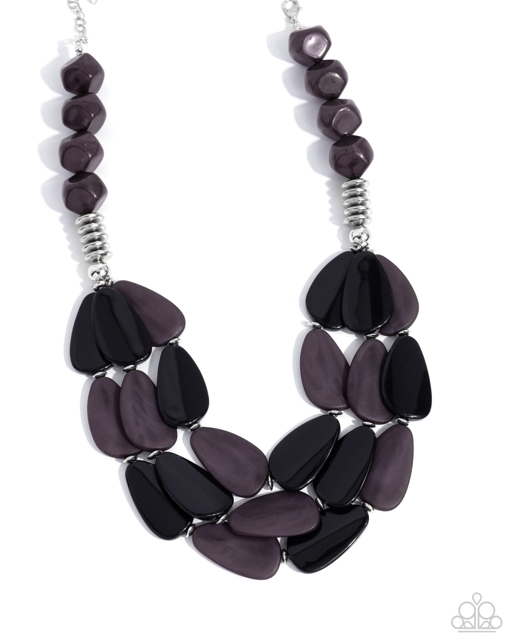 Infused along an invisible string, a quartet of defaced smooth smoky gray beads lead to a quintet of silver discs and a solitaire silver bead. Splitting off into strands, a collection of smooth black and smoky gray teardrop acrylics alternate with silver discs below the neckline for an attention-grabbing abstract display. Features an adjustable clasp closure.