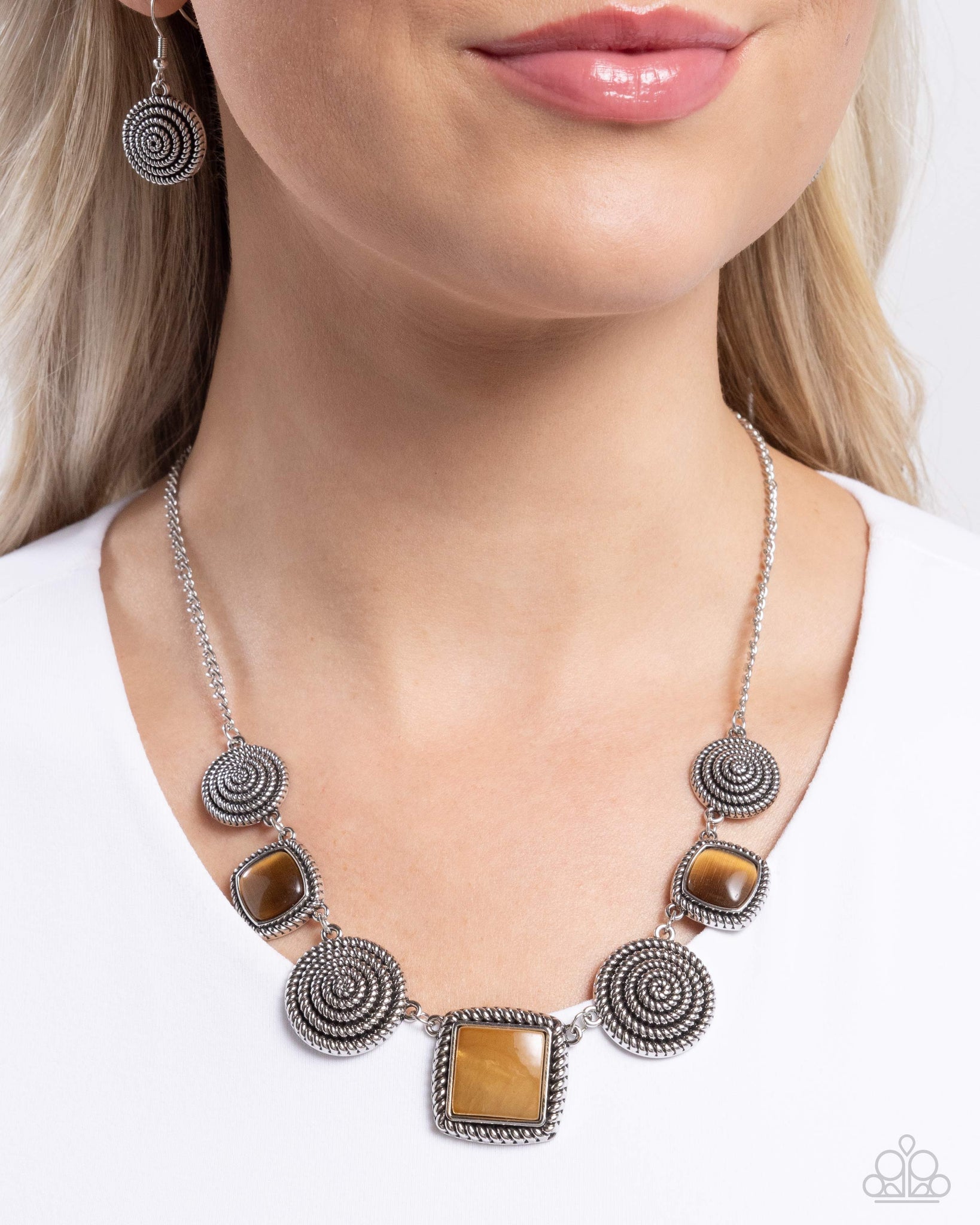 Pressed in textured spiral silver frames, a collection of glassy brown cat's eye square stones alternate with glistening silver spirals along the neckline for a sassy showcase of color. Features an adjustable clasp closure.