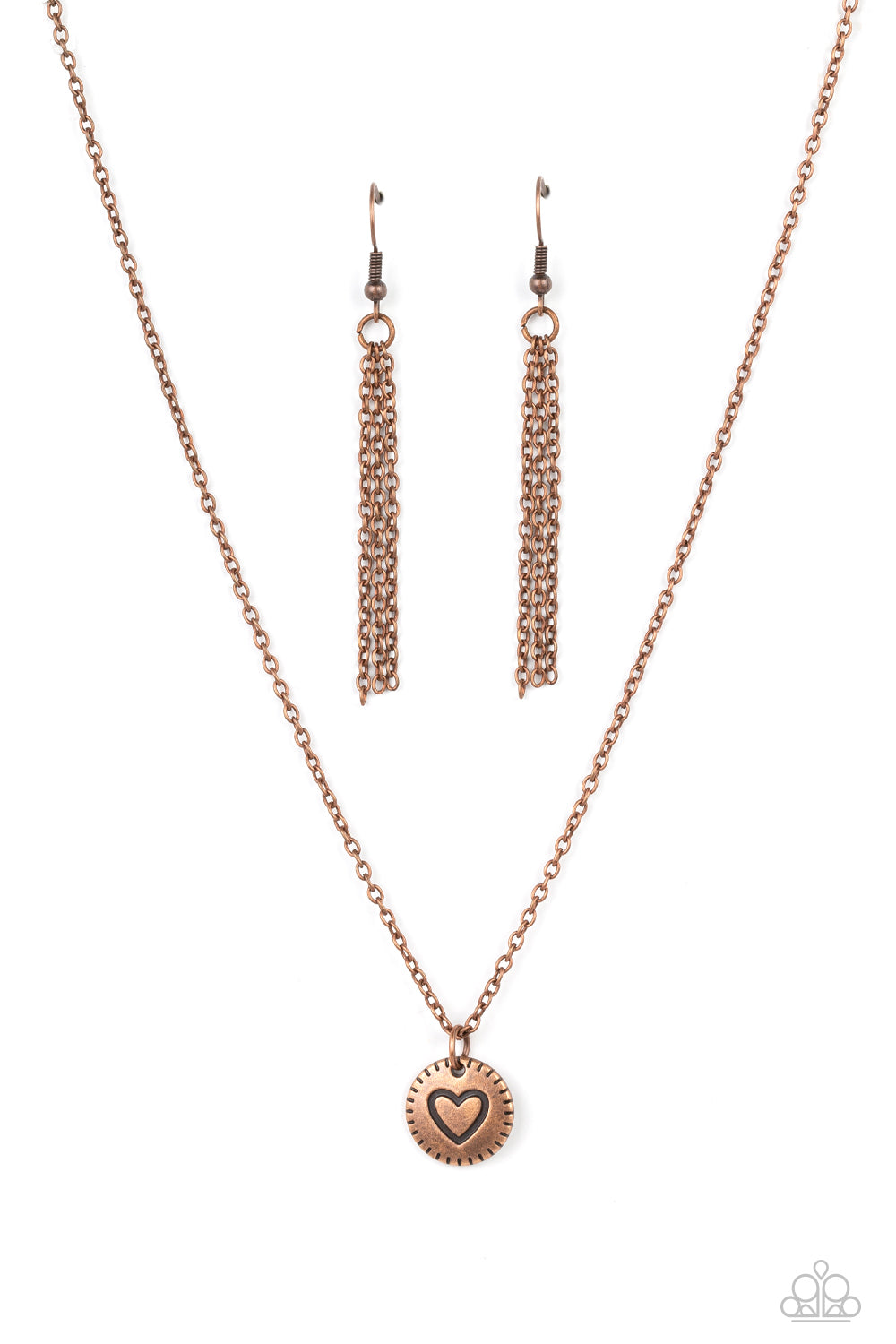Stamped in a heart burst pattern, a round copper pendant is suspended from a dainty copper chain for a sentimental statement piece. Features an adjustable clasp closure.