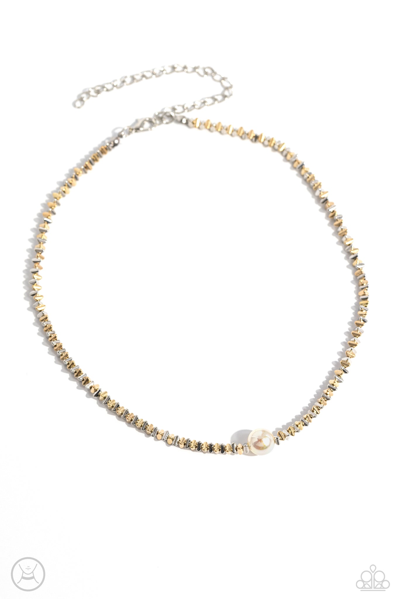 Infused along an invisible string, an edgy collection of high-sheen silver and gold triangle beads coalesces around the collar to meet a white pearl at its center for a refining finish. Features an adjustable clasp closure.