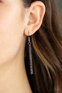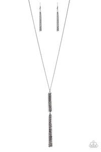 As if rolled in glitter, a chain of smoky rhinestones spins tightly into a rounded gunmetal pendant that swings from the bottom of a lengthened gunmetal chain. A shimmery gunmetal tassel dangles from the bottom of the sparkling pendant for a flirty finish. Features an adjustable clasp closure.