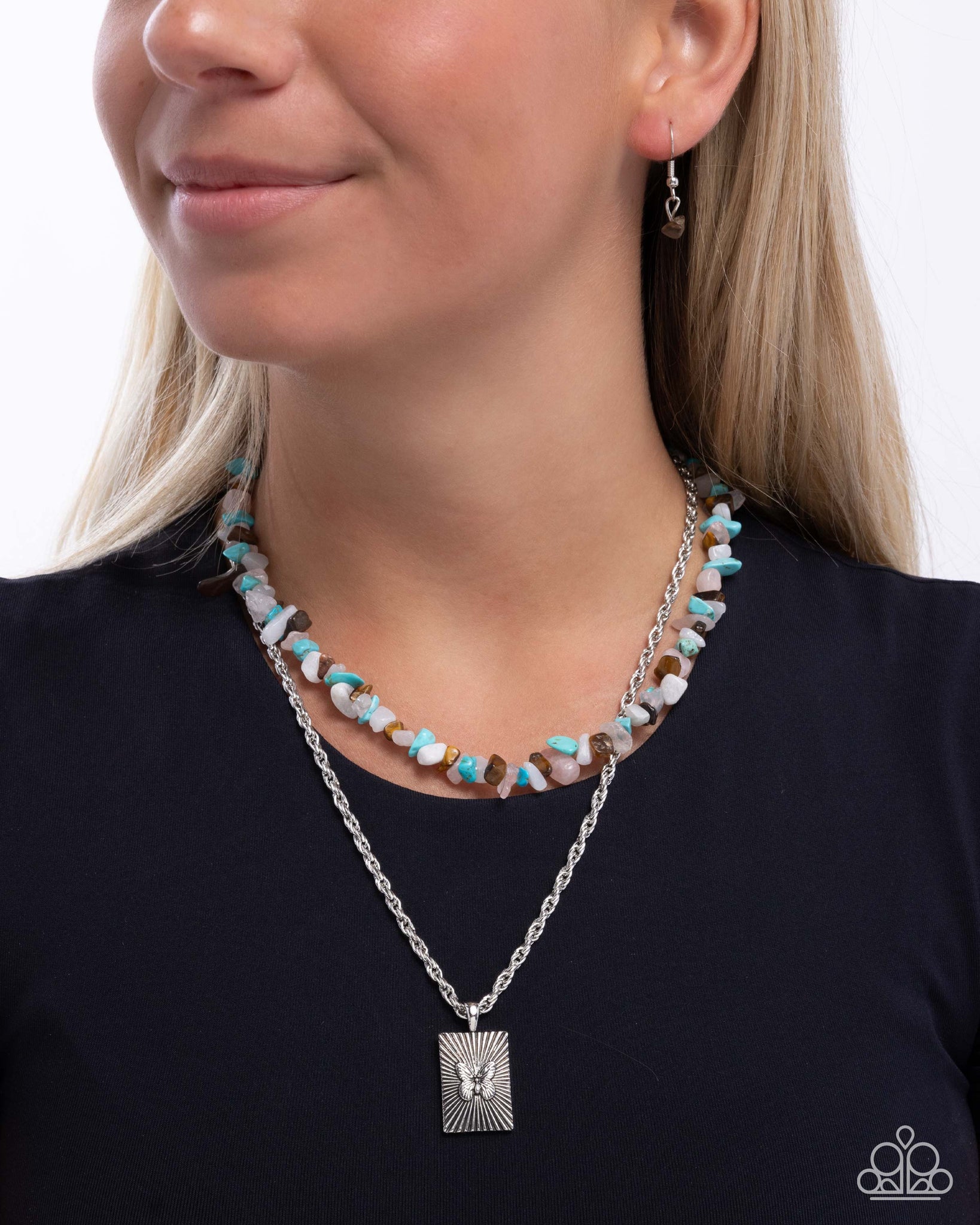 Two rows of textured chains drape around the neck. One chain is adorned with colorful natural stone chips in shades of turquoise, Tiger's Eye, rose quartz, and white, while the other features a textured silver pendant embossed with a butterfly motif. As the stone elements in this piece are natural, some color variation is normal.