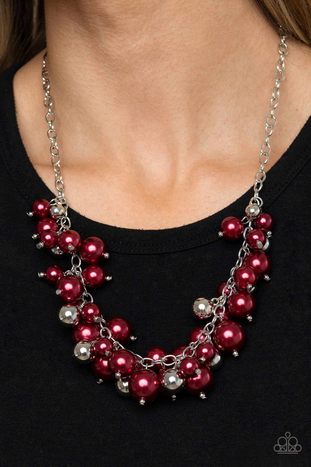 A bubbly collection of shiny silver and pearly red beads cluster along a shimmery silver chain below the collar, creating a vivacious fringe. Features an adjustable clasp closure.