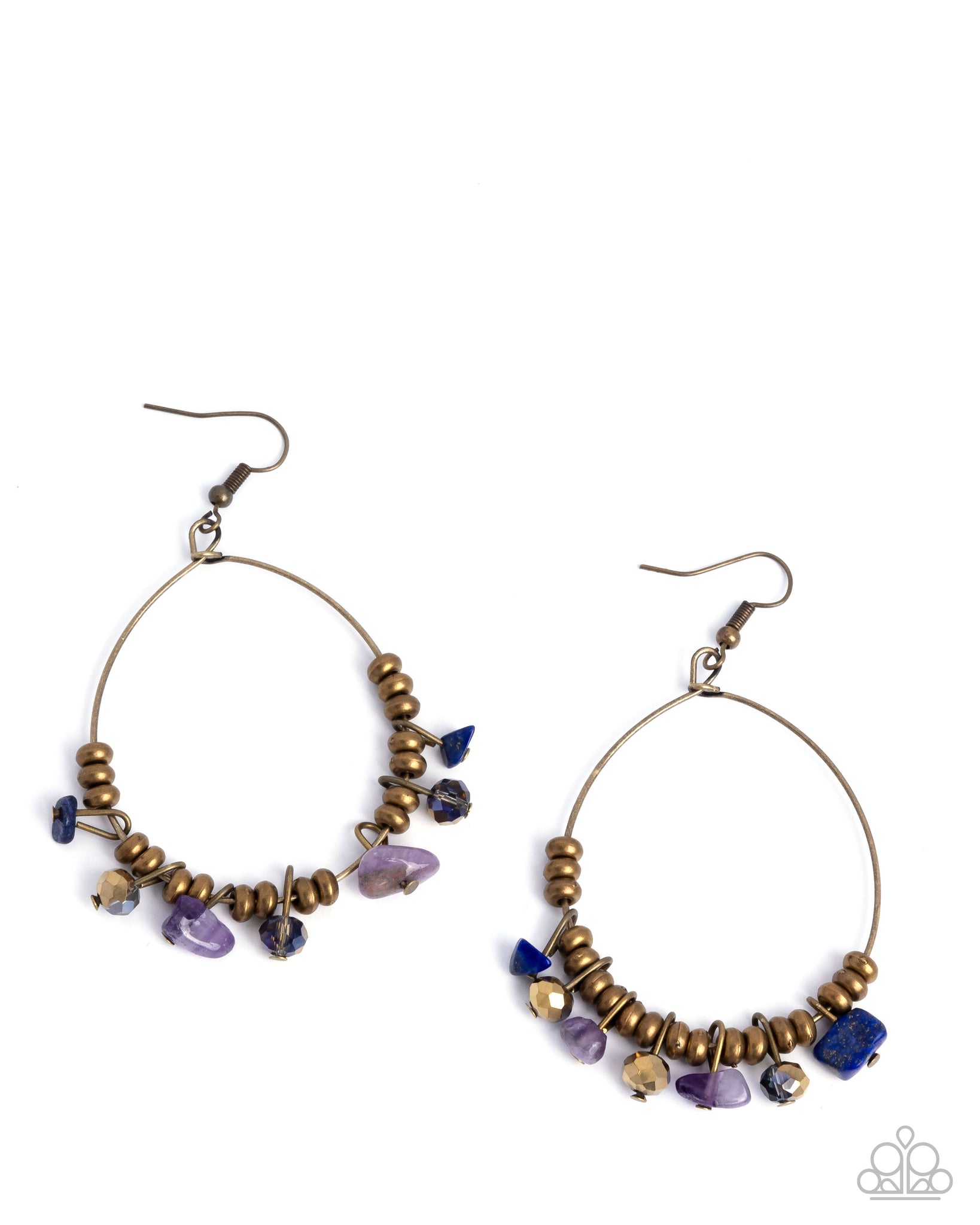 Infused along a wire brass teardrop frame, a collection of glistening brass beads alternate beside chiseled lapis and amethyst stones and UV shimmery brass beads that dangle below the ear creating an earthy fringe. Earring attaches to a standard fishhook fitting. As the stone elements in this piece are natural, some color variation is normal.