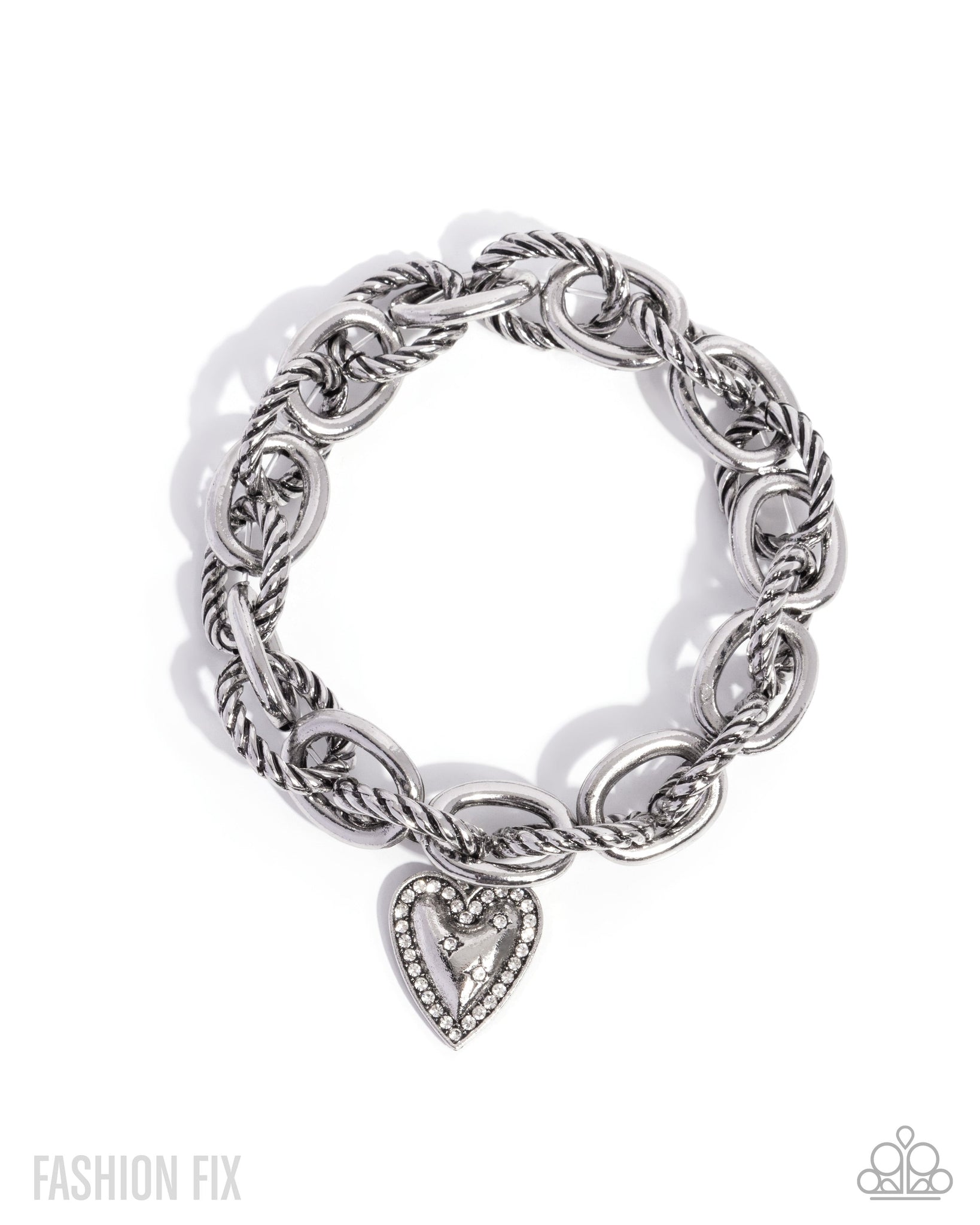 Featuring an alternating pattern, a collection of textured cable chain links joins sleek silver rings along the wrist for an eye-catching statement. A white rhinestone-lined heart padlock charm that features solitaire white rhinestone stars atop its center sways below the mismatched links for a heartfelt, haute finish. Features elastic stretchy bands.