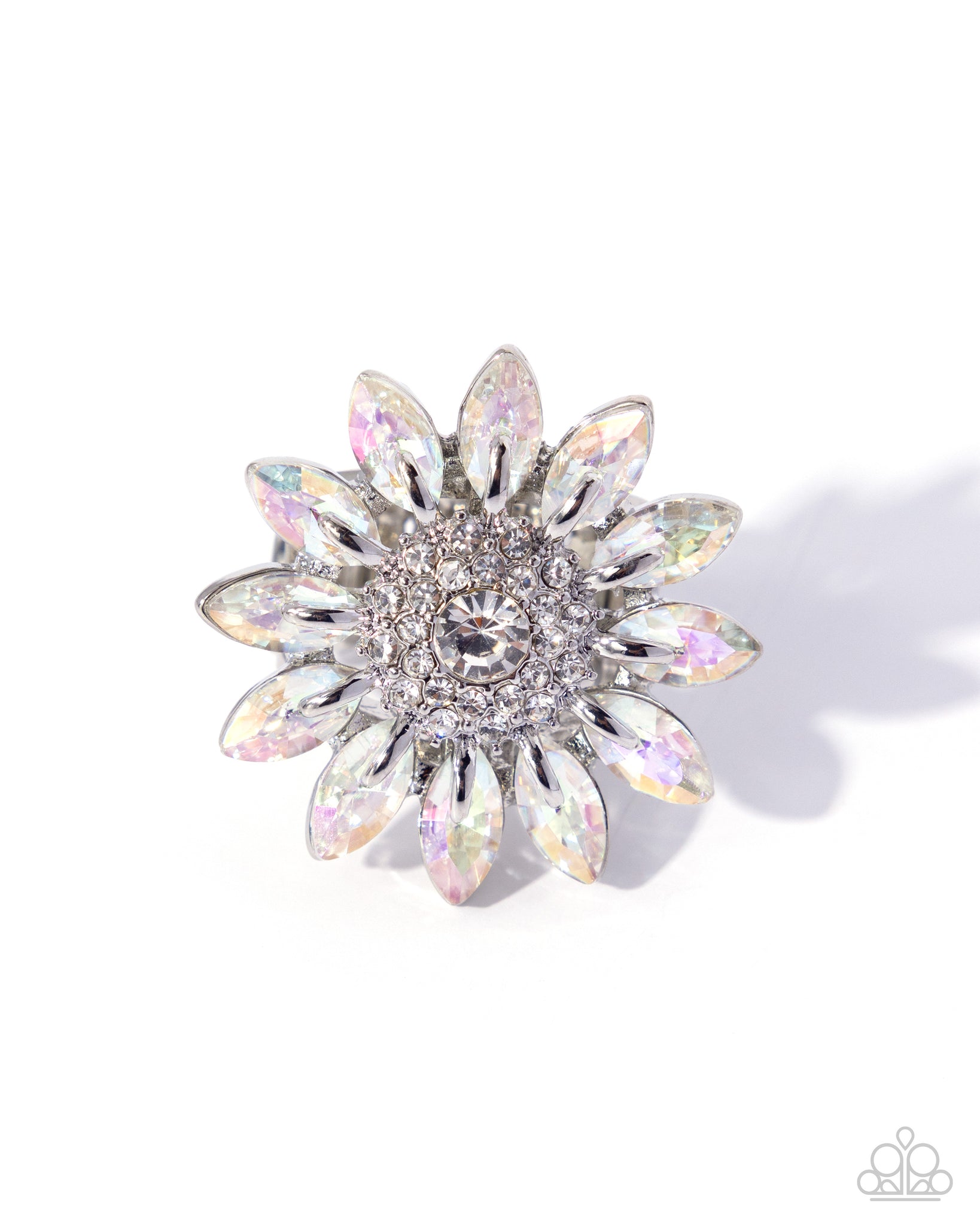 Featuring a white gem center, rows of white rhinestones coalesce atop the finger, leading the eye to a collection of silver-pronged, white iridescent marquise-cut petals for a fabulously faceted floral centerpiece. Features a stretchy band for a flexible fit. Due to its prismatic palette, color may vary.