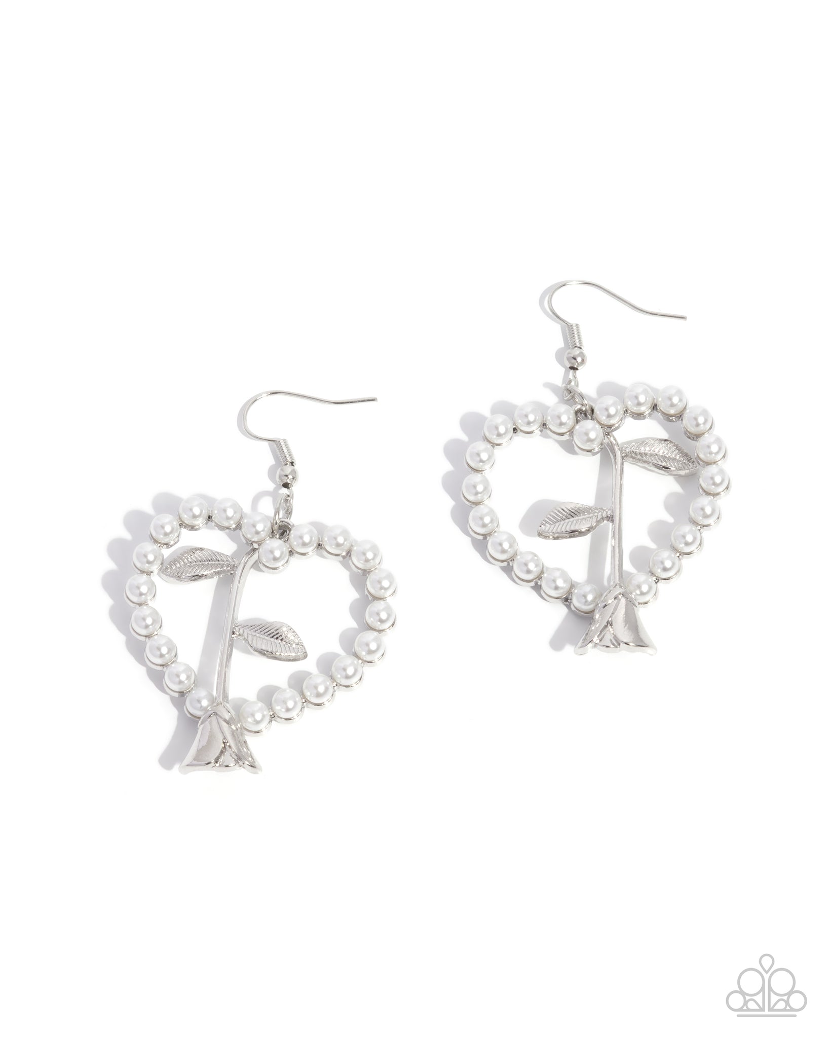 Featuring tactile textured silver leaves, an upside-down silver rose stem blooms through the center of a dainty white pearl-embellished silver heart frame, reflecting below the ear for a delightfully darling look. Earring attaches to a standard fishhook fitting.