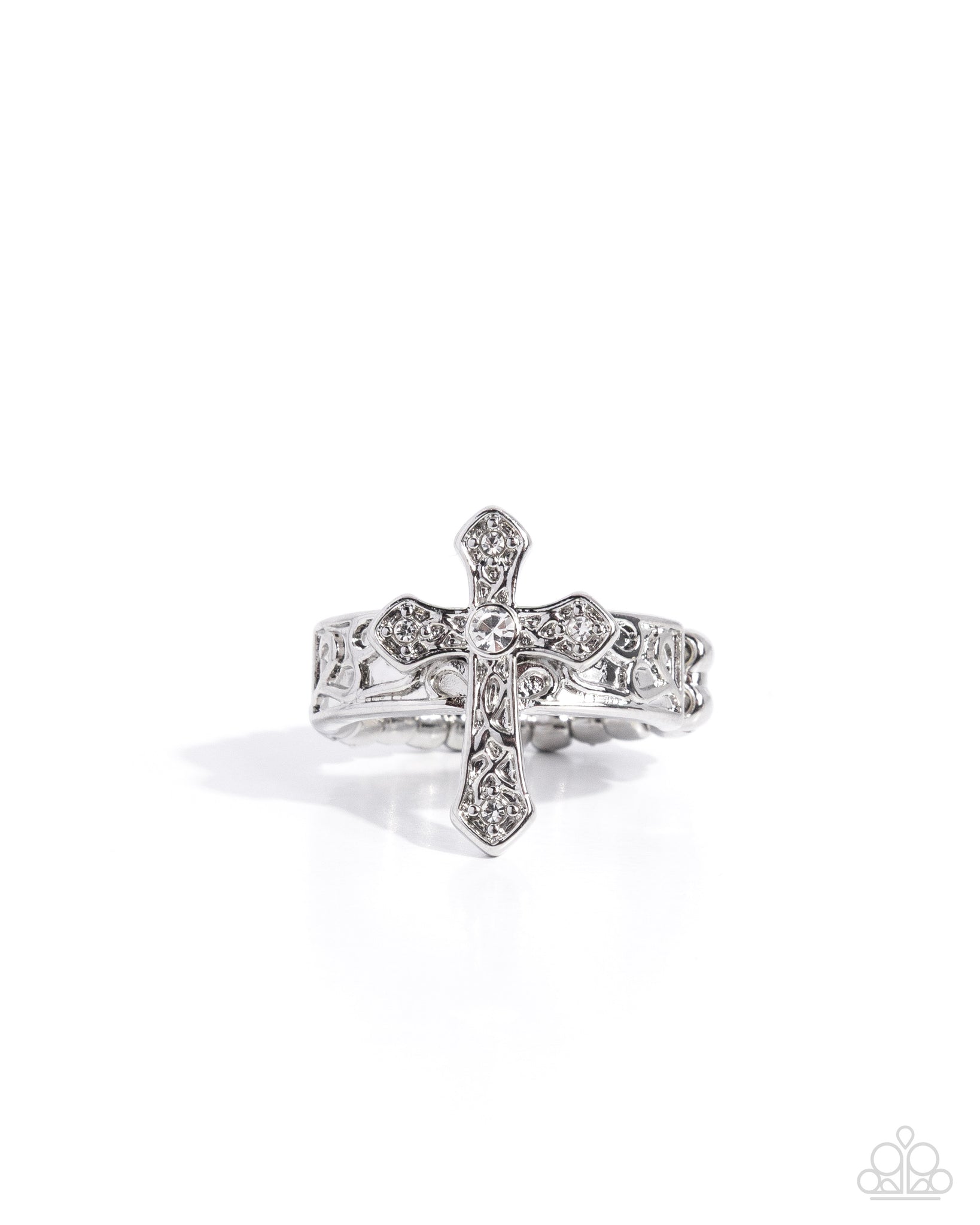 Featuring curly filigree, a white rhinestone-dotted silver cross stands out atop a similarly embellished filigree silver band for a radiantly heavenly display. Features a dainty stretchy band for a flexible fit.