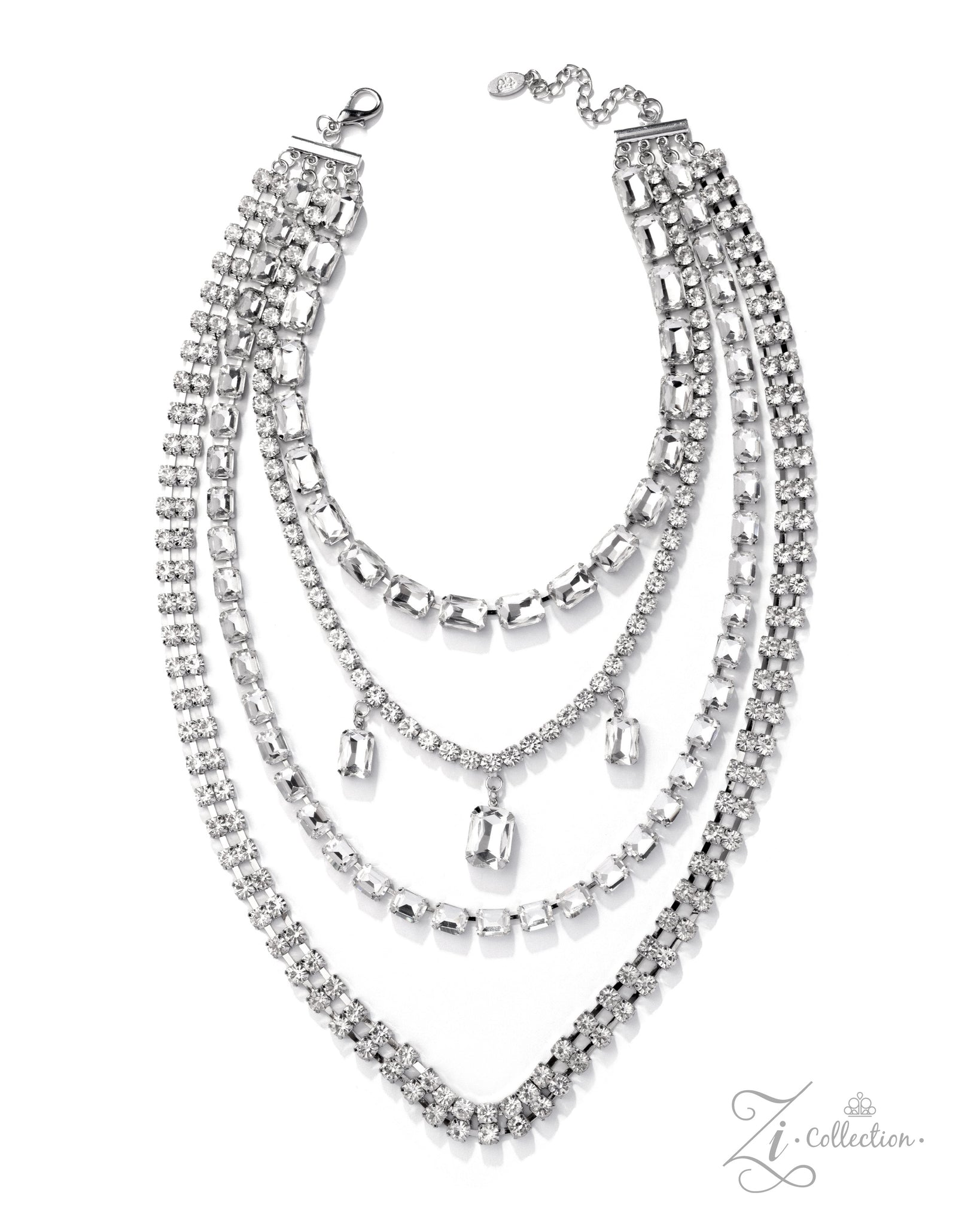 A chaotic collision of oversized emerald-cut gems and glistening rhinestone chains fearlessly cascades down the chest, creating an unapologetically industrial shimmer. Dripping in faceted brilliance, the bold array of jagged sparkle layers into a fearless fringe of grit and glam. From the center strand, a trio of solitaire emerald-cut gems sways with every step, amplifying the drama with an audible shimmer that refuses to be ignored. Features an adjustable clasp closure.