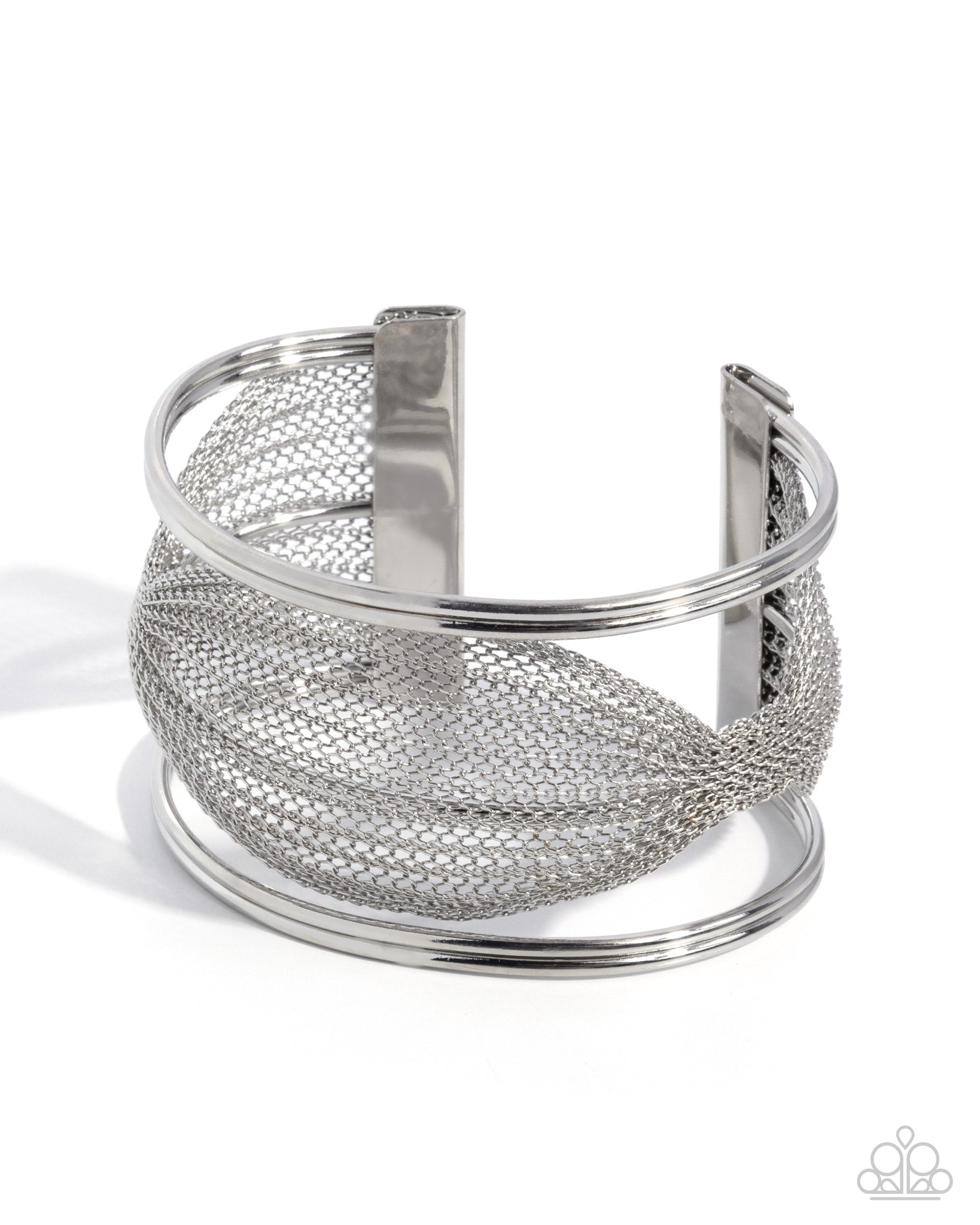 Modeled after chain mail, slightly pinched rows of silver wiry chains are strung between two layered silver bars, coalescing into a boldly stacked cuff around the wrist.