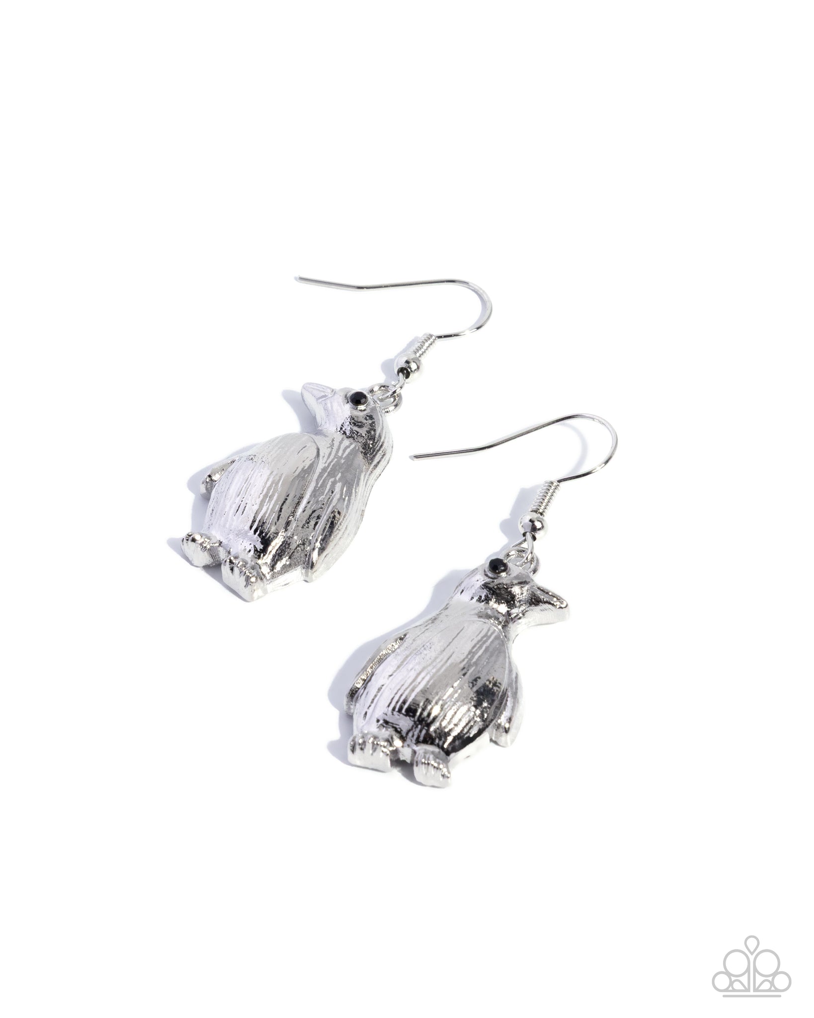 Dotted with a black rhinestone eye, a textured silver penguin waddles below the ear for an adorably Arctic lure. Earring attaches to a standard fishhook fitting.