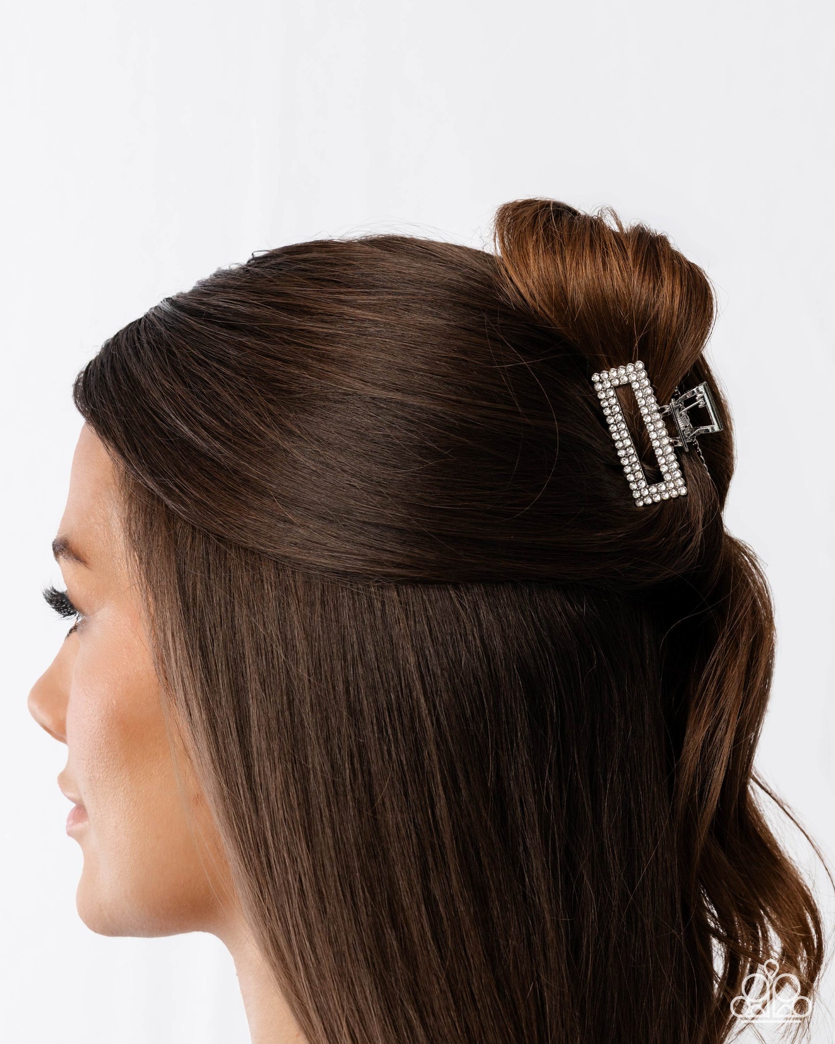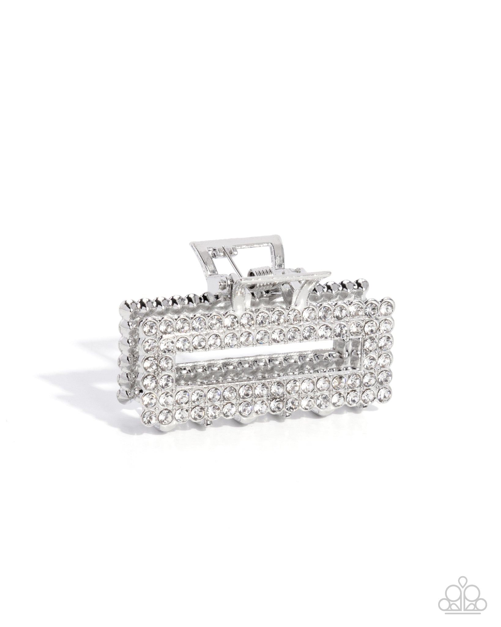 Pressed in radiant silver fittings, rows of dainty white rhinestones stand out atop a glistening silver claw clip holding the hair away from the face for an on-the-go shimmery display. Clip measures approximately 1 3/4" in length and 1" in width.