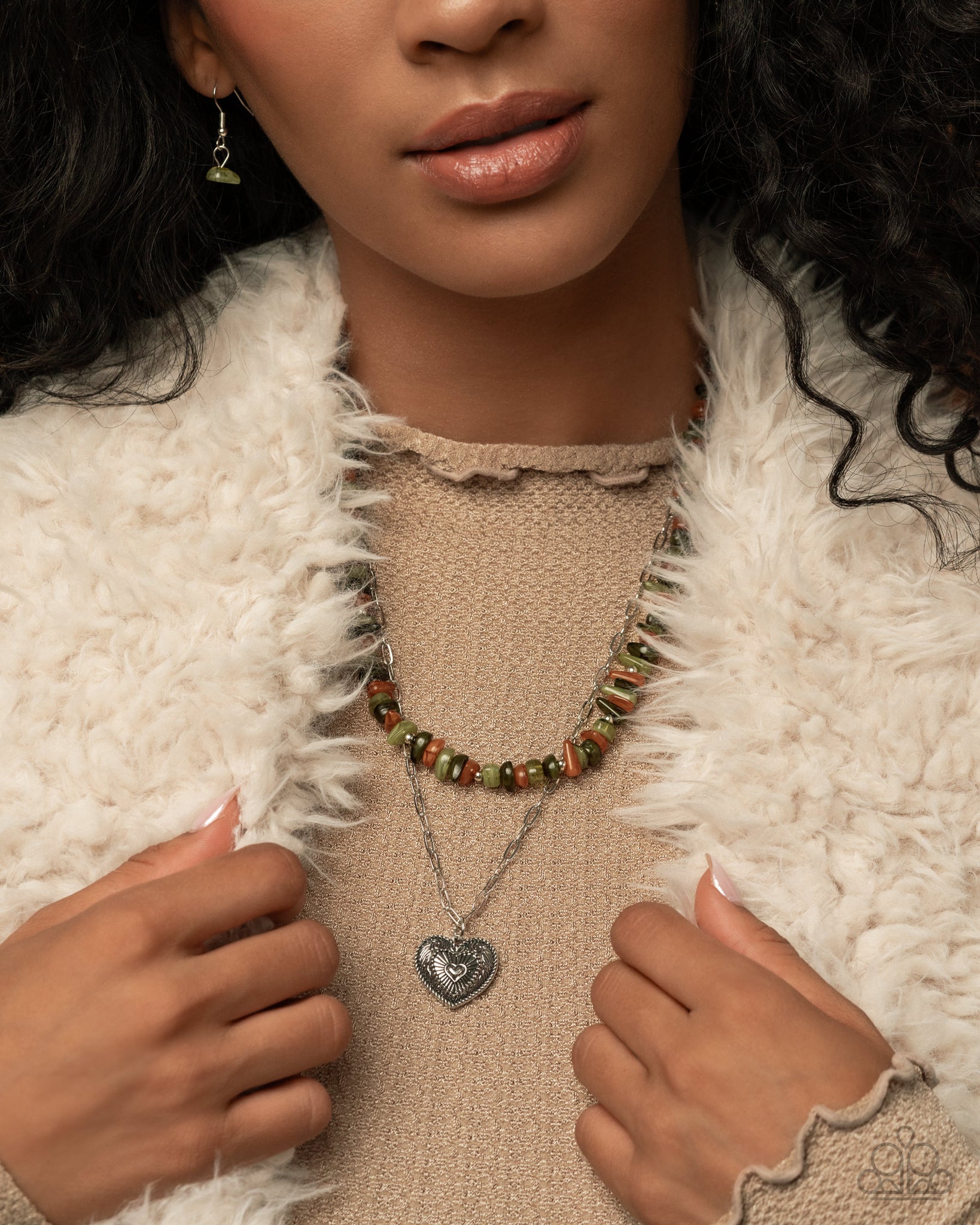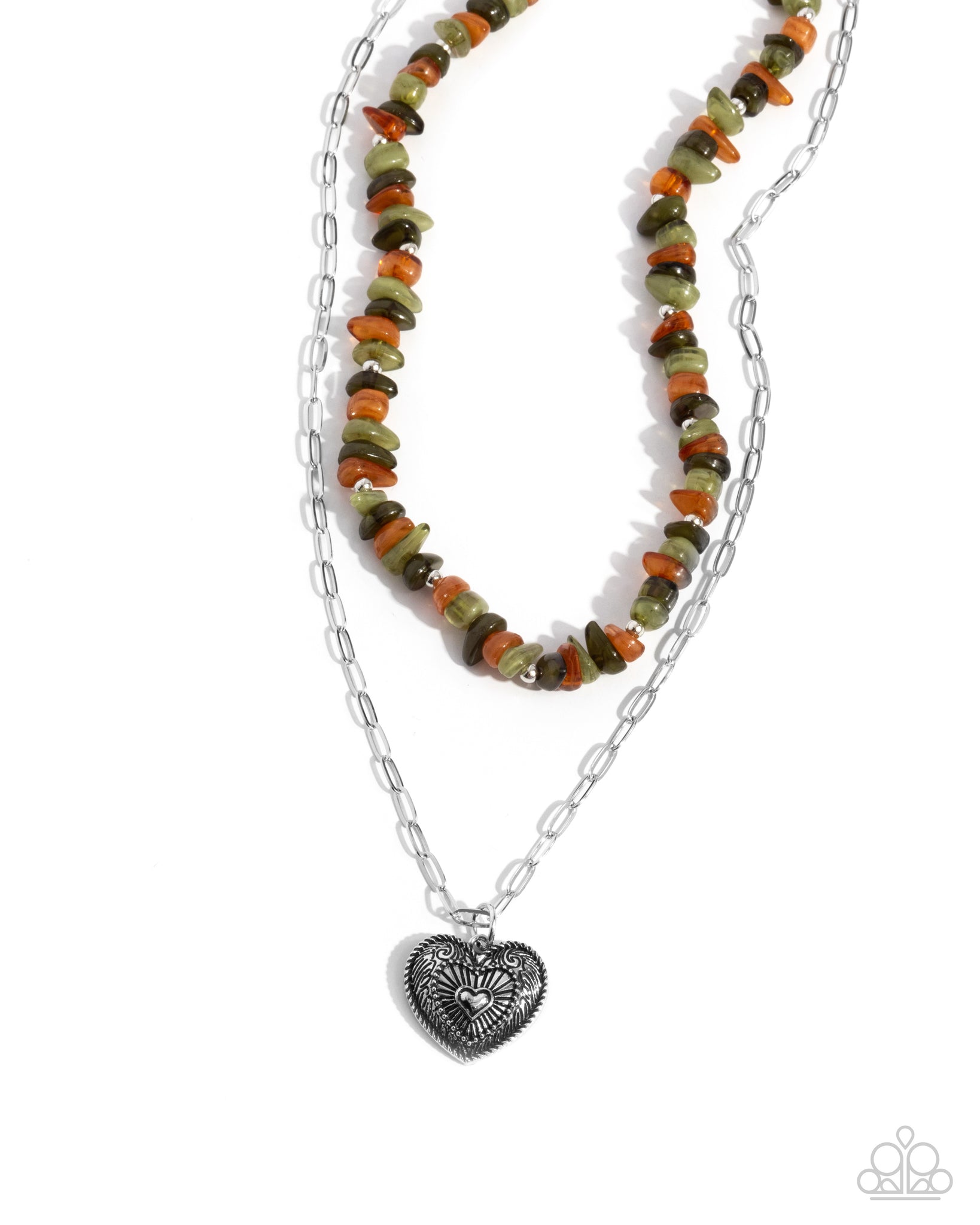 Infused along an invisible string, a collection of Fern, Olive, and Buckthorn Brown pebbled stones alternate with silver studs below the neckline, layering with a silver paperclip chain for an earthy pop of color. Embellished in textured filigree, a silver heart pendant glides along the paperclip chain for a heartfelt finish. Features an adjustable clasp closure. As the stone elements in this piece are natural, some color variation is normal.