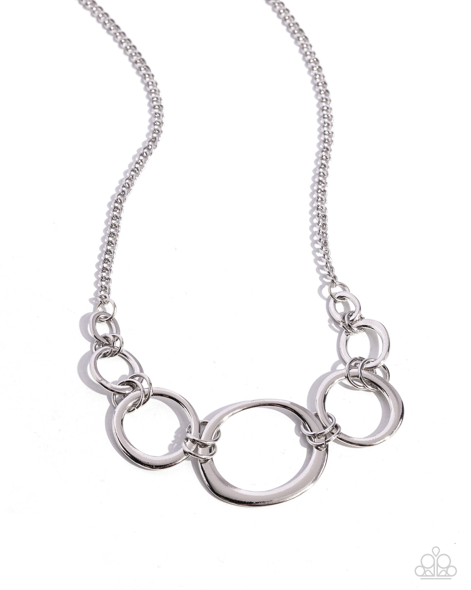 An asymmetrical collection of flat silver hoops delicately links with dainty silver rings below the collar. Attached to a classic silver chain, the dizzying rings gradually increase in size for added dimension. Features an adjustable clasp closure.