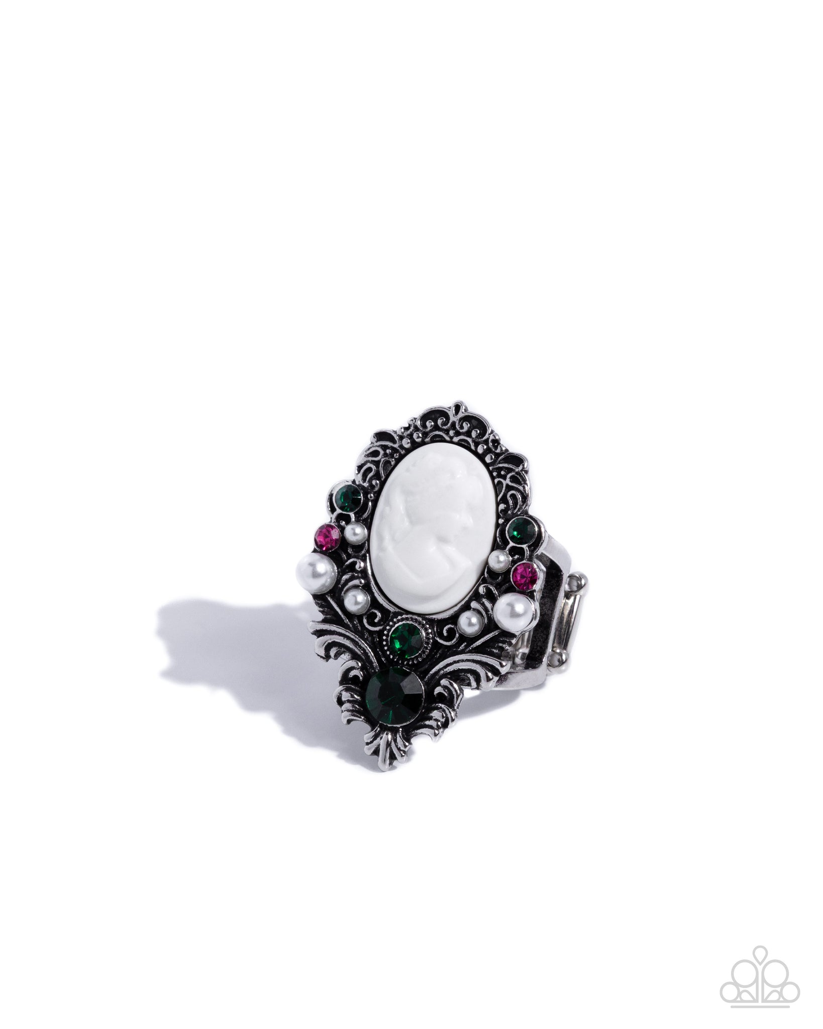 Inspired by a Victorian-style cameo, a white resin oval backdrop features a demure lady who looks to the side atop the finger. Glossy white pearls and emerald and fuchsia rhinestones dot around the frame's ornate border for additional charm and glitz. Features a stretchy band for a flexible fit.