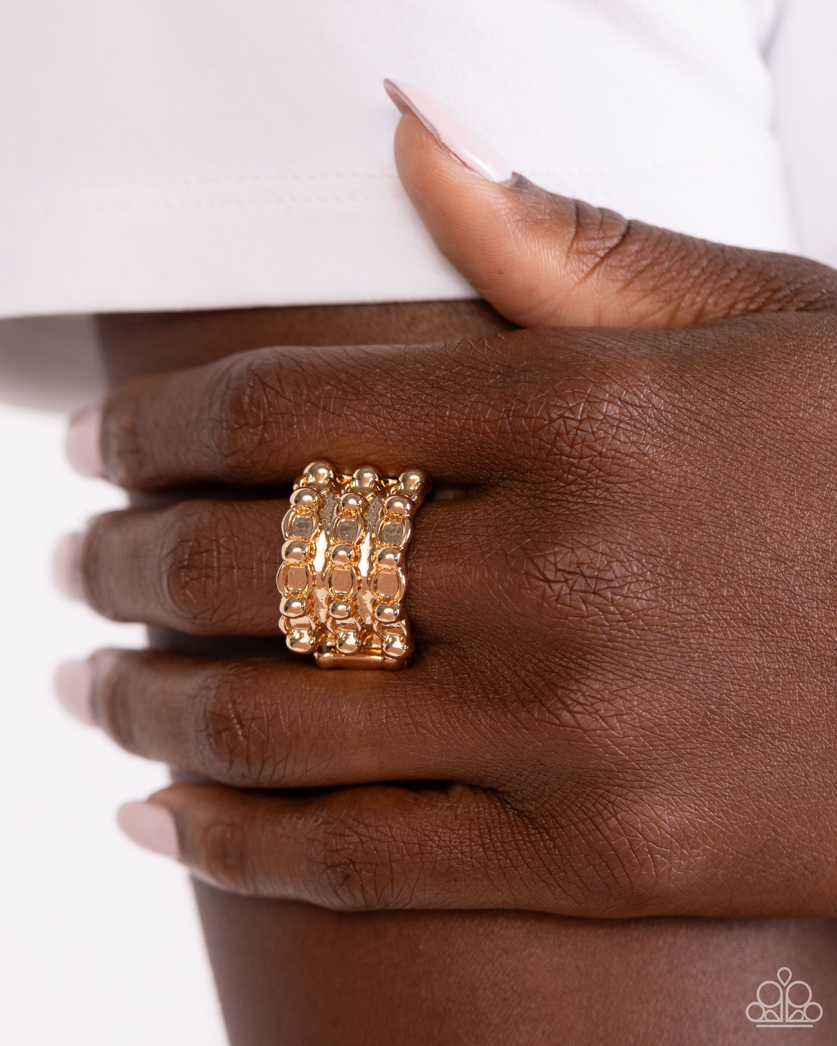 Rows of gold studs and gold chain-like links stack across the finger, resulting in a gritty and glamorous display. Features a stretchy band for a flexible fit.