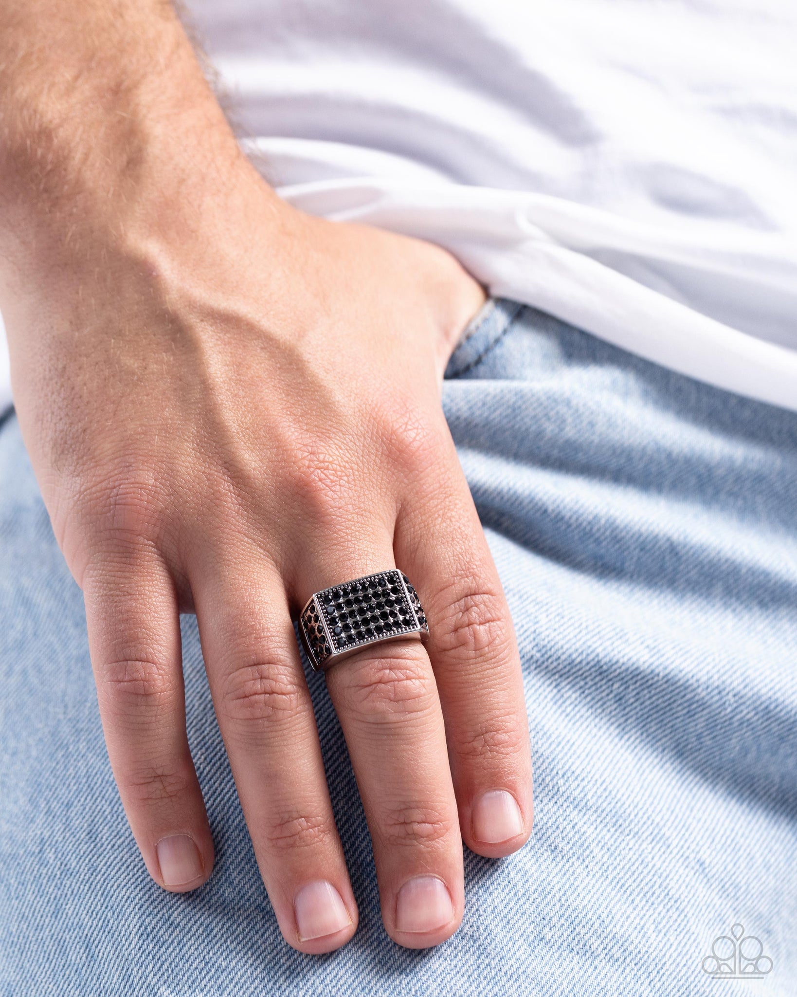 The front of a rectangular silver frame is encrusted in sections of black rhinestones, resulting in a smoldering centerpiece atop the finger. Features a stretchy band for a flexible fit.