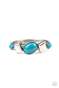 Refreshing Mosaic Blue oval beads and antiqued silver square frames are pressed into the textured front of a cuff-like bangle, creating a colorful pop of color around the wrist. Features a hinged closure.