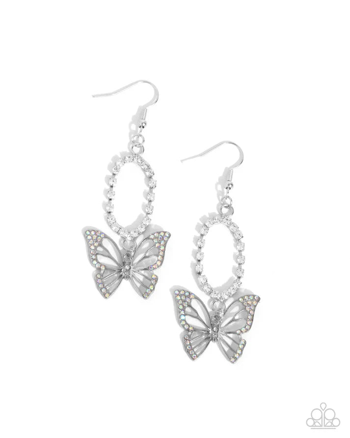 Pressed in silver square fittings, a strand of glistening white rhinestones forms into an opulent oval that gives way to an iridescent rhinestone-embellished airy silver butterfly for a whimsical lure. Earring attaches to a standard fishhook fitting. Due to its prismatic palette, color may vary.