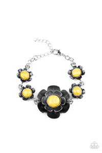 Layers of lifelike silver petals bloom from sunny yellow centers, creating gorgeous floral fittings that wrap around the wrist. The frames vary in size, with the largest flower sitting at the center of the design in a dramatic finish. Features an adjustable clasp closure.