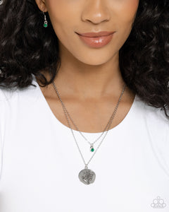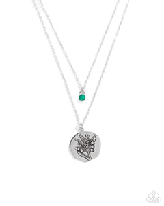 Two shimmery silver chains layer down the chest. Featuring an emerald rhinestone in a silver frame, the uppermost strand gives way to a classic silver pendant featuring an embossed lily-of-the-valley flower, flawlessly displaying the sentimental symbols that celebrate those born in May. Features an adjustable clasp closure.