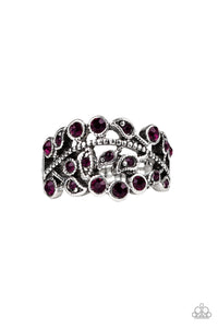 Dotted in dainty purple rhinestones, leafy silver bands stack across the finger, coalescing into a whimsically layered band. Features a dainty stretchy band for a flexible fit.
