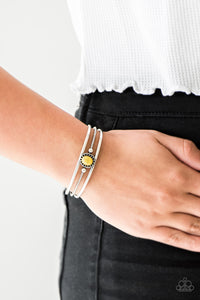 Serrated and smooth silver bars arc across the wrist, coalescing into an airy cuff. Infused with a studded frame, a sunny yellow stone is pressed into the center of the cuff for a seasonal look.