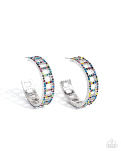 Pressed in a wavy frame of silver, a collection of dainty multicolored rhinestones curls around the ear in a doubled airy display. Dainty multicolored rhinestones interconnect the two wavy airy frames, creating an industrial squared hoop for an edgy look. Earring attaches to a standard post fitting. Hoop measures approximately 1 1/2" in diameter.