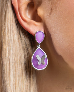 An exaggerated light orchid teardrop-shaped acrylic bead swings from the bottom of an upside-down light orchid teardrop-shaped bead, creating a dramatically colorful lure. A dainty silver butterfly flutters atop the center of the bottom bead for a whimsical finish. Earring attaches to a standard post fitting.