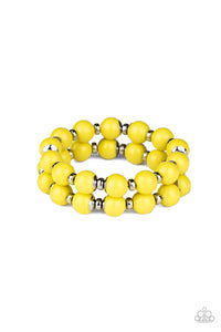 Connected together by two dainty silver fittings, a bubbly collection of yellow beads and shiny silver accents are threaded along two stretchy bands around the wrist for a bold pop of color.