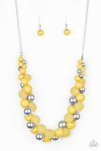A bubbly collection of imperfect silver, opaque, and yellow beads are threaded along an invisible wire below the collar, creating a colorful cluster. Features an adjustable clasp closure.